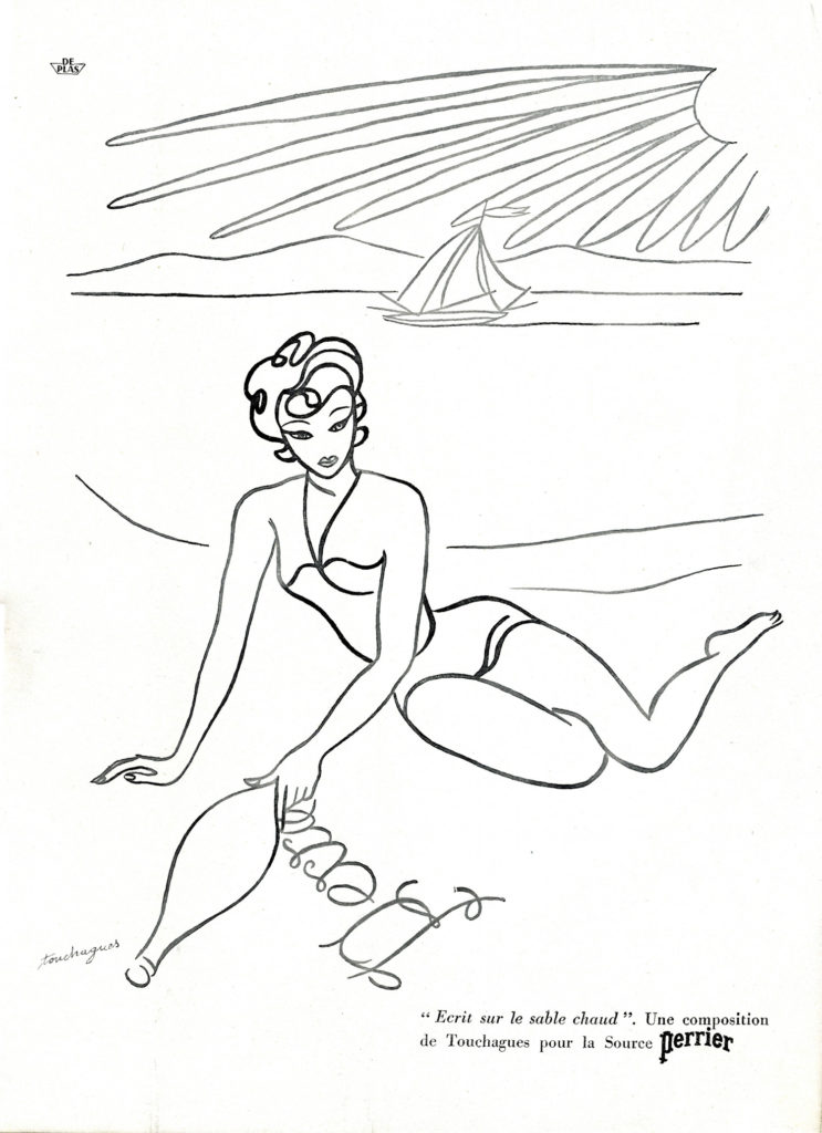 Touchagues s’était fait un nom dans l’illustration. On lui a donc probablement demandé de produire quelques oeuvres à caractère publicitaire portant sa signature. Touchagues ne s’y est jamais consacré comme le grand Cassandre ou son contemporain Loupot. Son style y est resté figuratif, proche de celui de ses oeuvres d’illustration. Voici quelques exemples