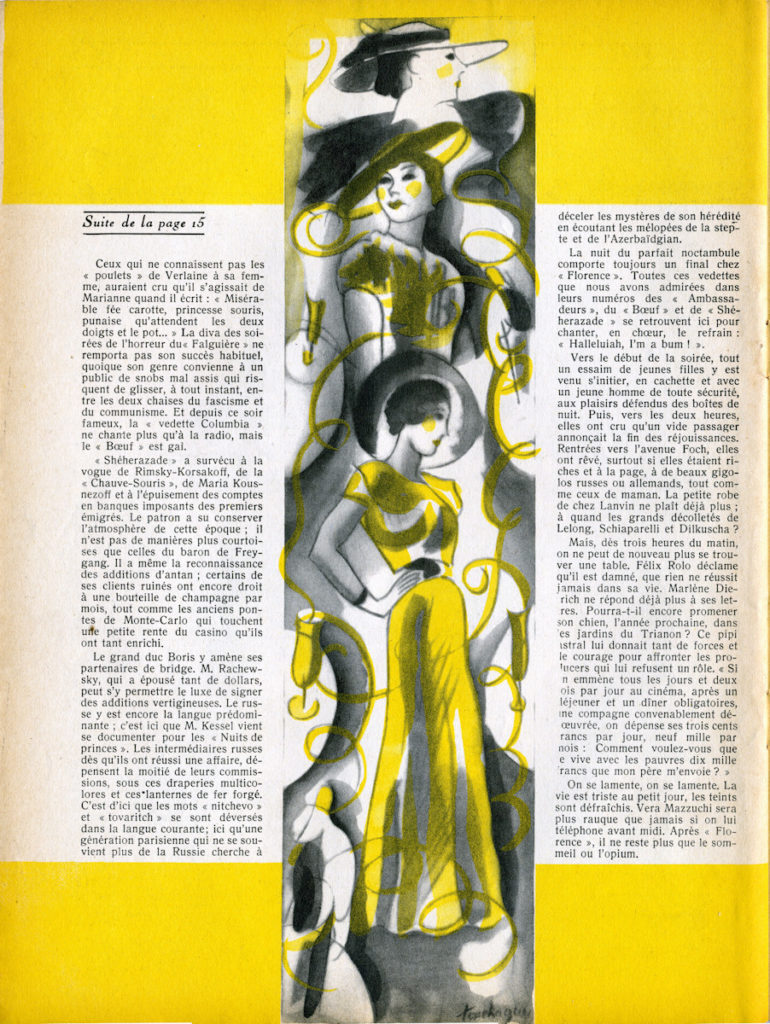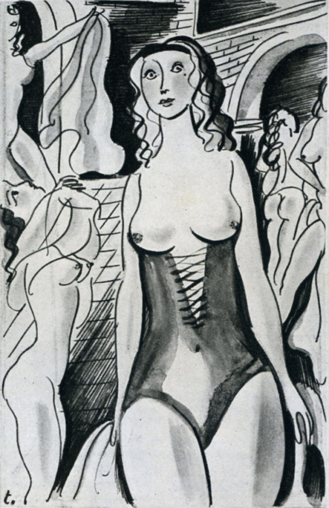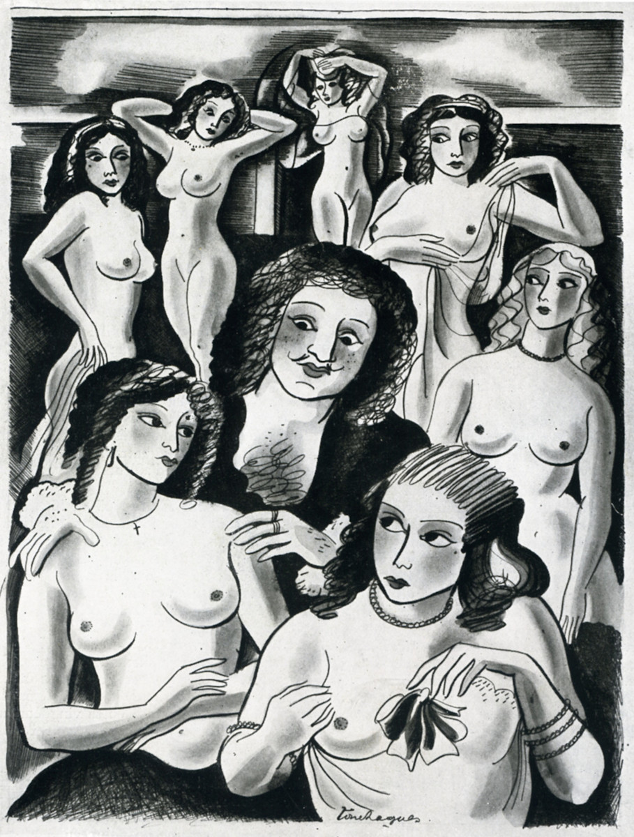 Paris Magazine compte parmi les magazines de charme les plus en vue des années 30. Mais au delà de ses nouvelles à l’audace subtile, de ses textes érotiques ou de ses reportages, le plus émoustillant restait sans doute les photos de nus de ses illustres contributeurs … floutées là où cela était nécessaire pour échapper aux rigueurs de la loi. Touchagues y était parfaitement à l’aise. Il a illustré plusieurs petites histoires galantes écrites par Léon Treich avec des images noir et blanc bien dans la ligne éditoriale du magazine :