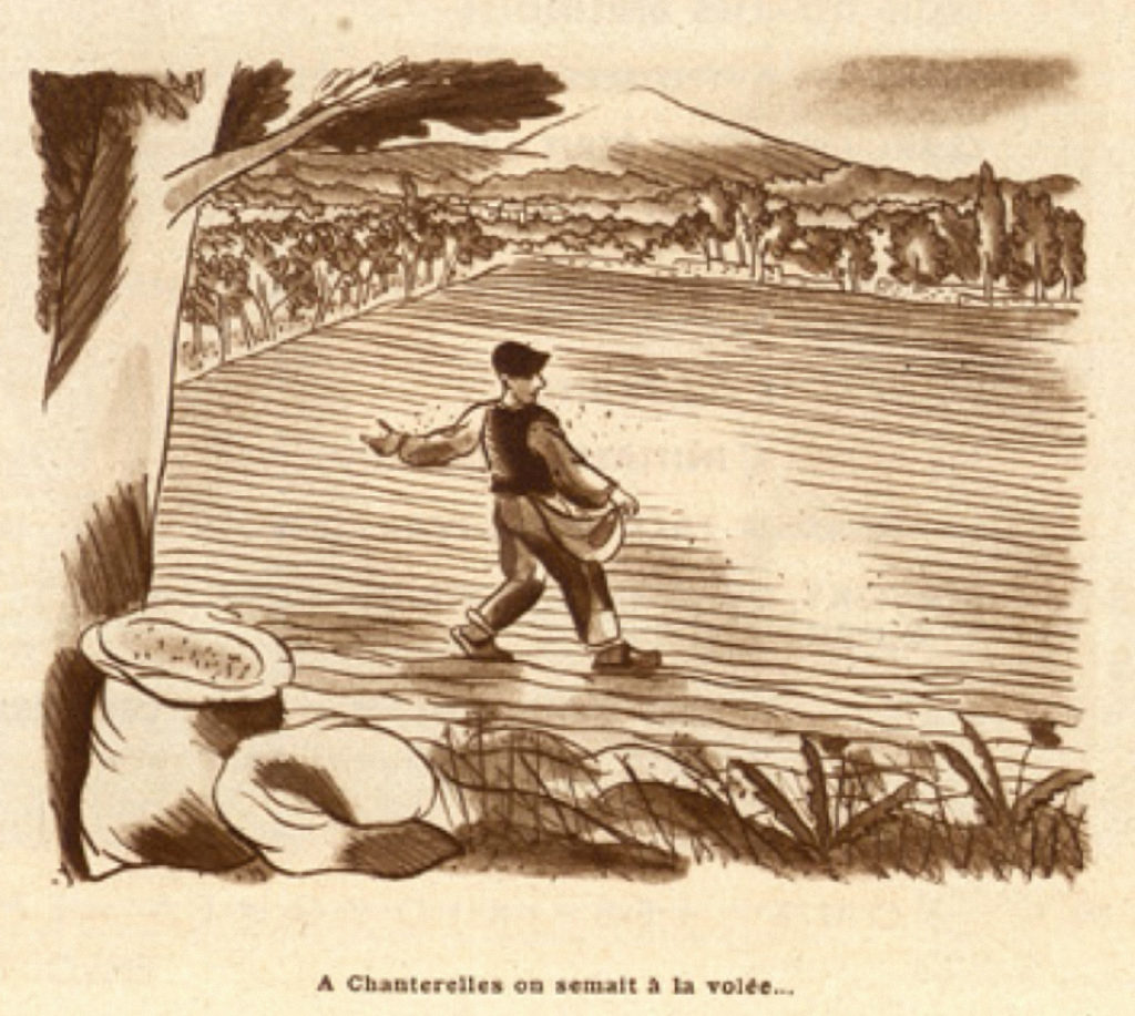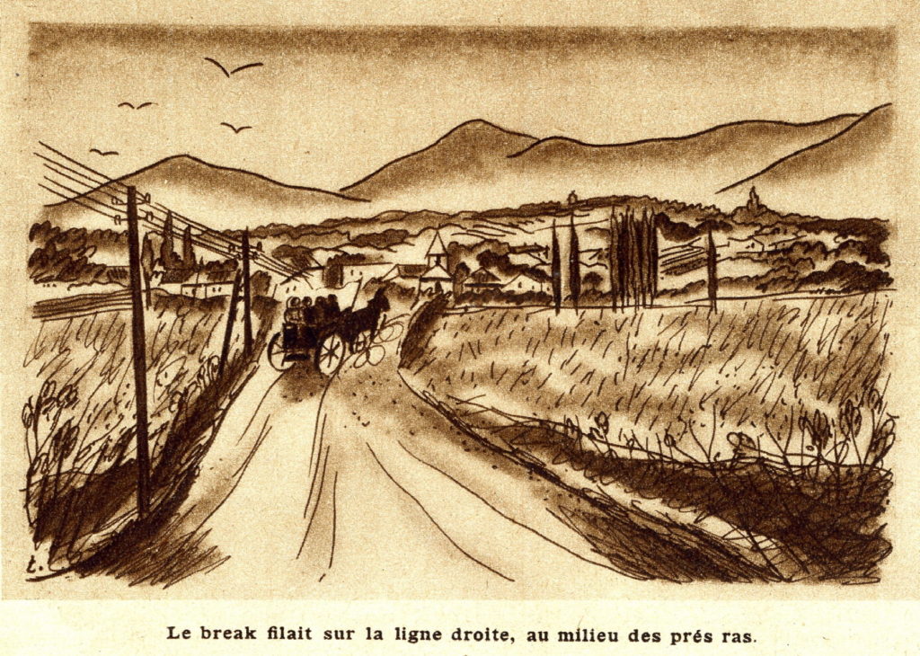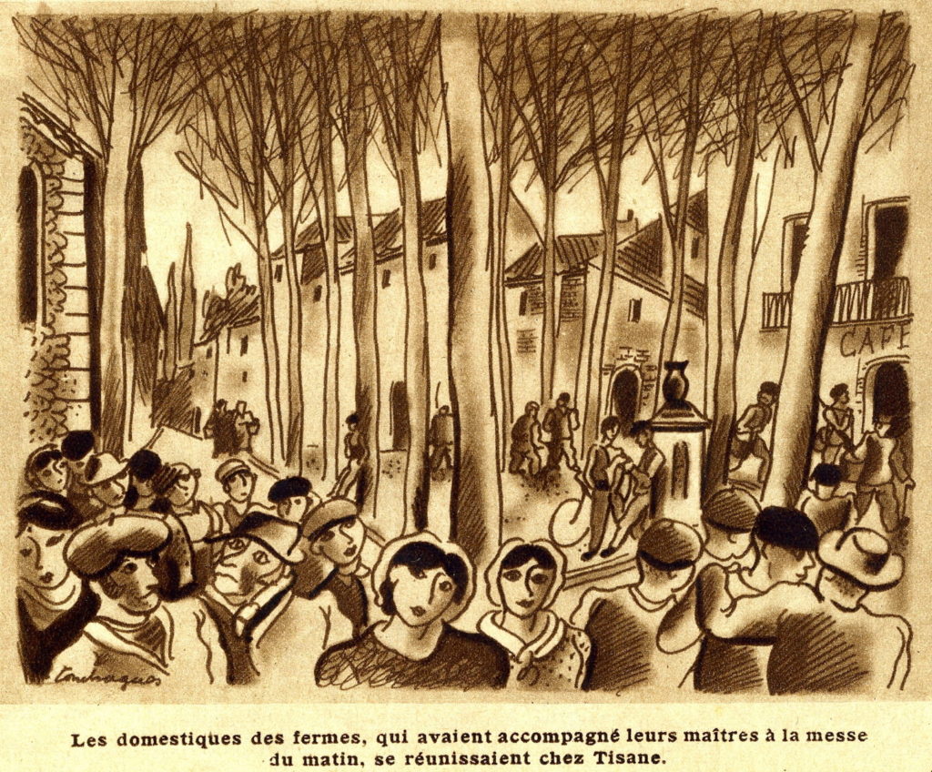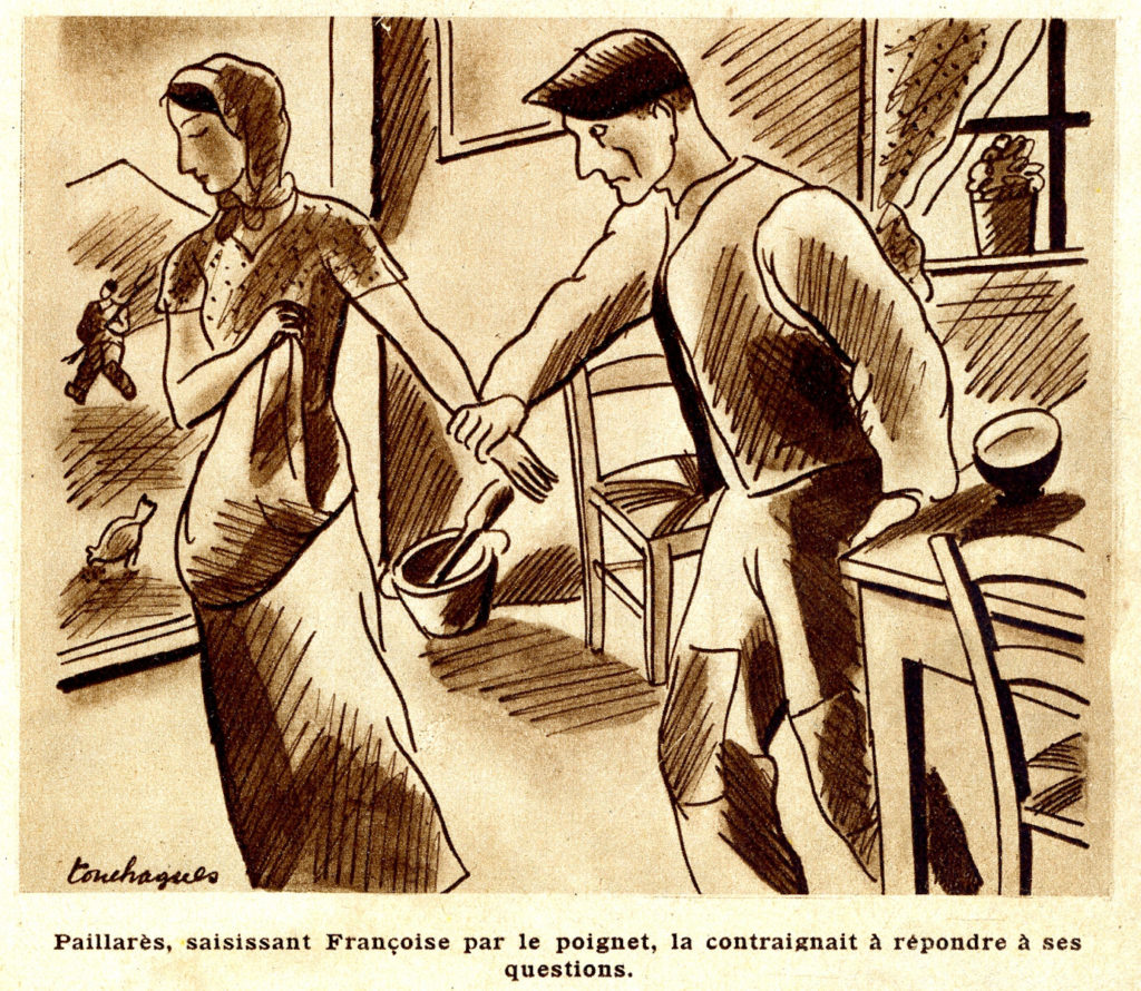 On retrouve là le dessin au trait et à l’estompe que Touchagues produisait en série à cette époque pour ses illustrations de revues, peut-être avec des touches d’aquarelles un peu plus soignées qu’ailleurs. Ce drame paysan se déroule en effet dans des paysages que Touchagues connaissait, sa famille paternelle étant d’origine catalane. L’ambiance villageoise et les paysages sont remarquablement rendus. Une petite sélection de ces dessins ci après :