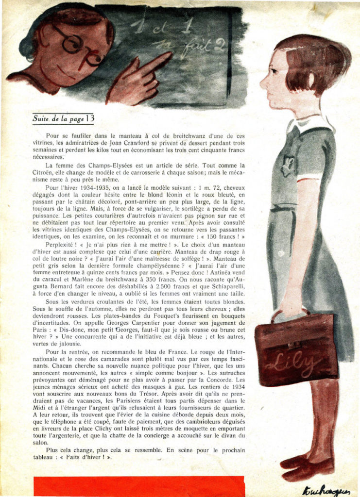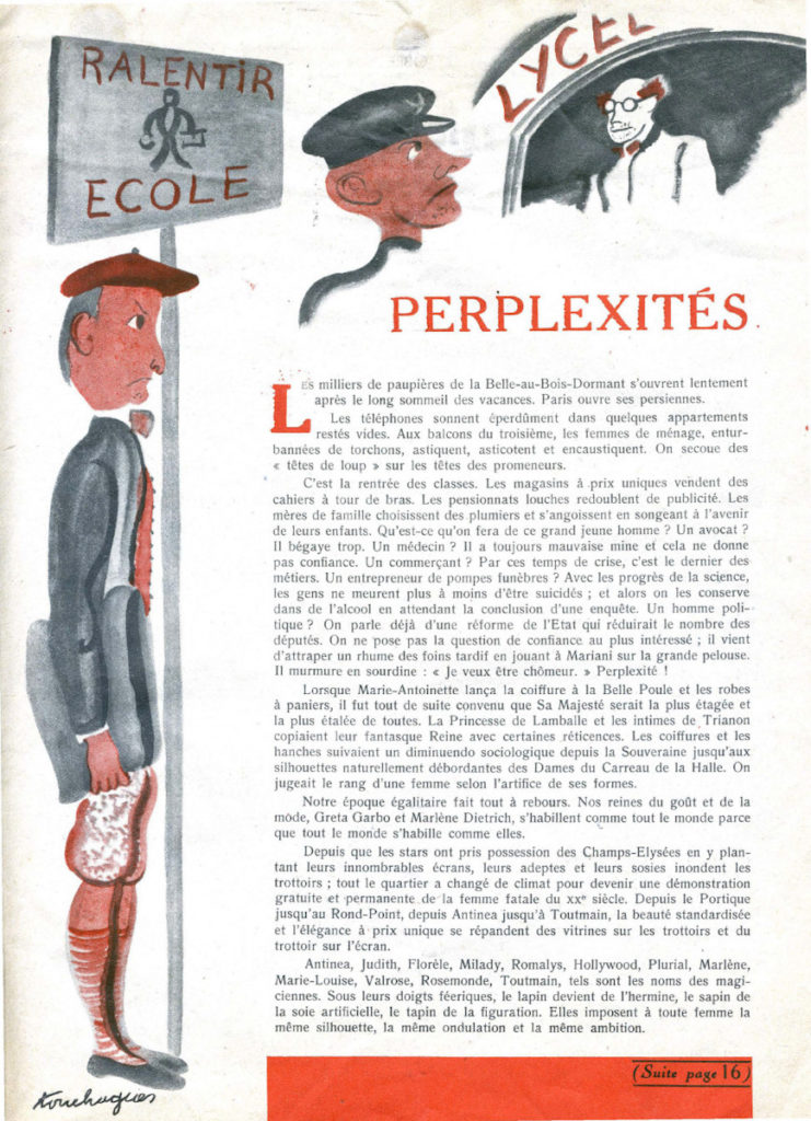 Comme pour le dessin de presse, il est assez difficile de faire entrer ces illustrations de textes dans un classement par genre ou par date. C’est pourquoi nous avons choisi d’en présenter une sélection par titre de presse dans un ordre approximativement chronologique. Tous les titres de presse des années 30 n’ont pas été explorés. Les collections publiques sont souvent très incomplètes pour ce type de publication et tout n’a pas été numérisé. Il faut donc explorer le marché des vieux papiers – avec tous ses aléas – pour, de temps en temps, trouver une pépite. Il reste donc des découvertes à faire. Ci dessous, une sélection d’illustrations d’articles de presse représentatifs de la production de Touchagues dans les revues explorées.