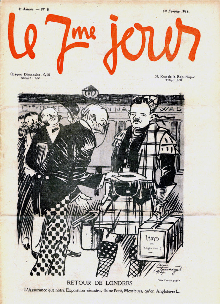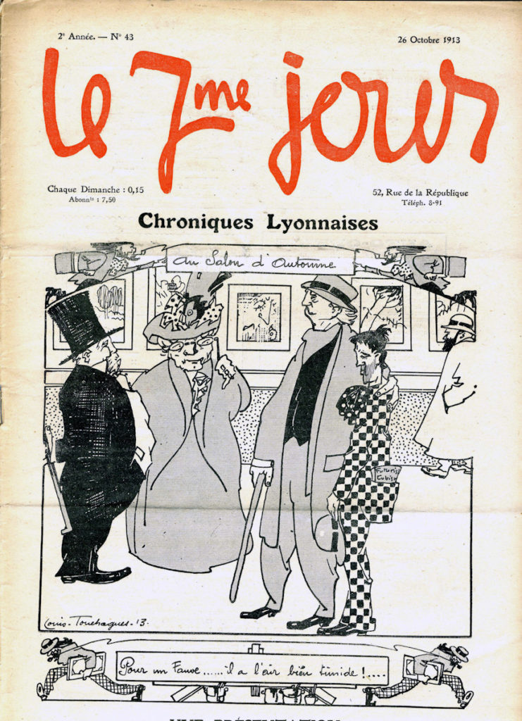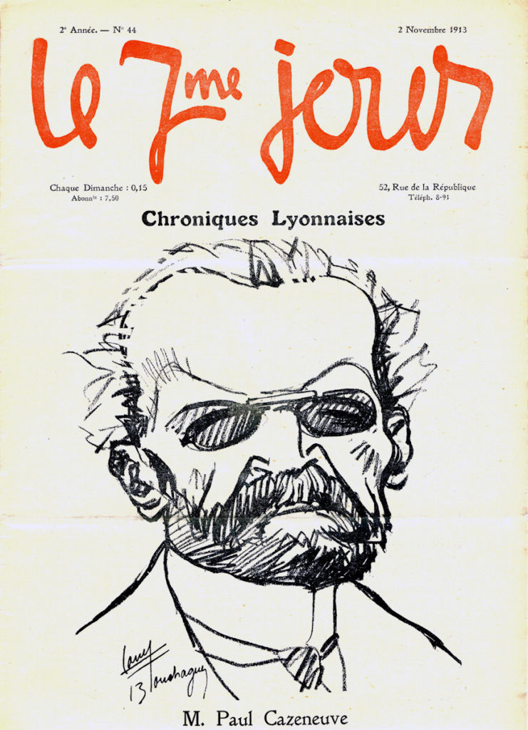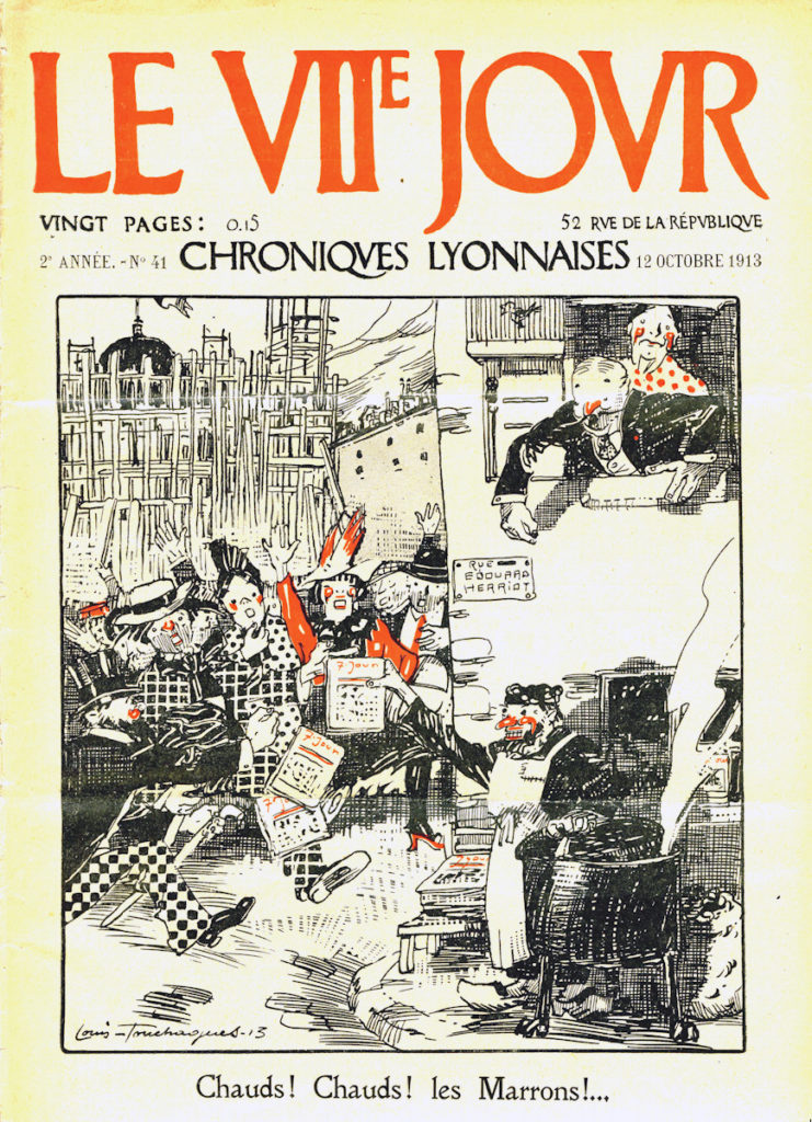 Le 7me jour, Chroniques lyonnaises est un hebdomadaire qui a été publié à Lyon entre 1912 et la première guerre mondiale. Sa page de couverture, imprimée en N&B (quelquefois rehaussé de rouge), était l’œuvre d’un dessinateur local. On connaît 7 couvertures illustrées par Touchagues. Vous en trouverez 4 ci dessous.