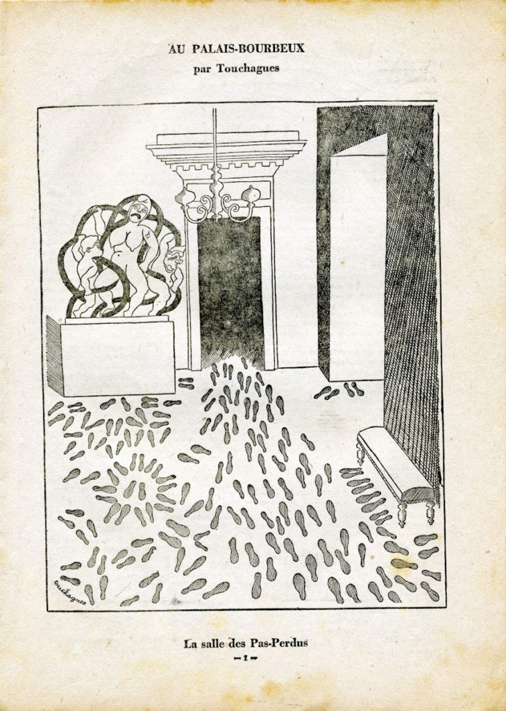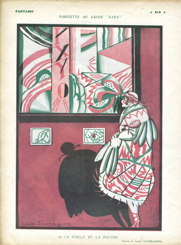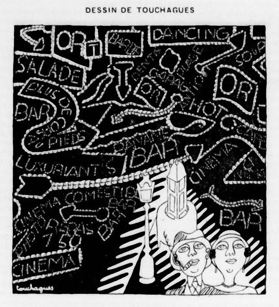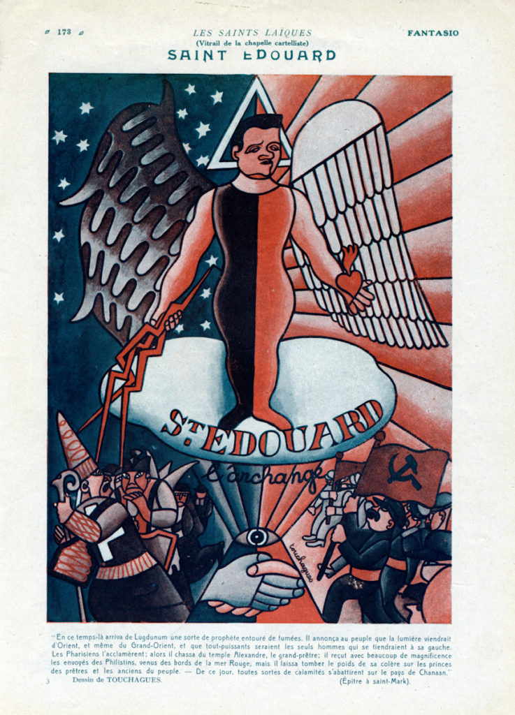 De sa première livraison à Fantasio en 1920, alors qu’il était encore à Lyon, à la dernière en 1926, Touchagues est allé de la saynète Dada au dessin humoristique sophistiqué, en passant par la caricature politique. Ses Saint-Edouard [Herriot] et Saint-Léon [Blum], bourrés de détails à explorer lentement, expriment avec force le positionnement politique de ses cibles dans un style Art Déco.