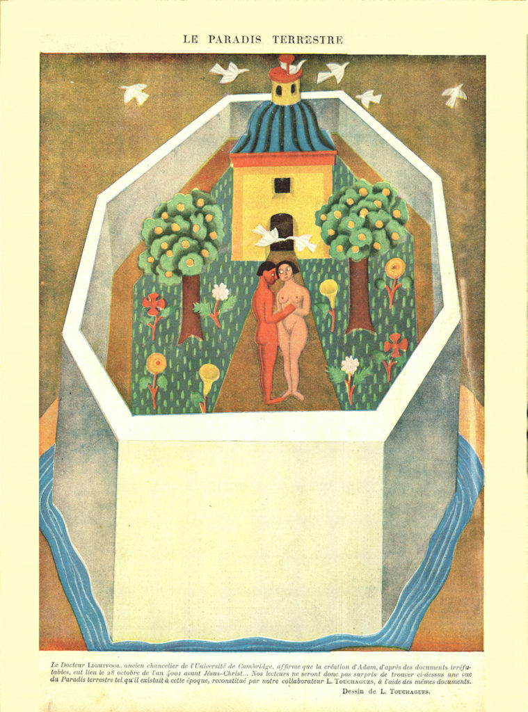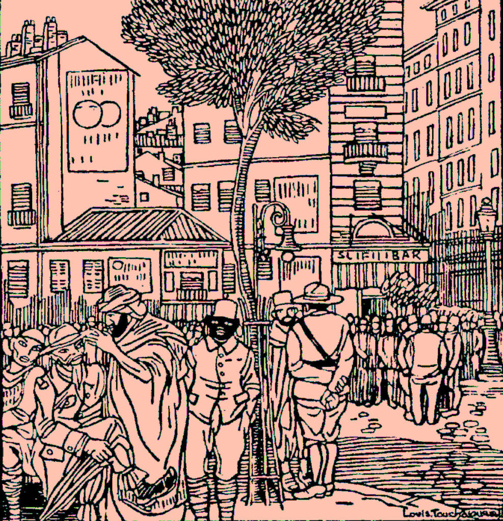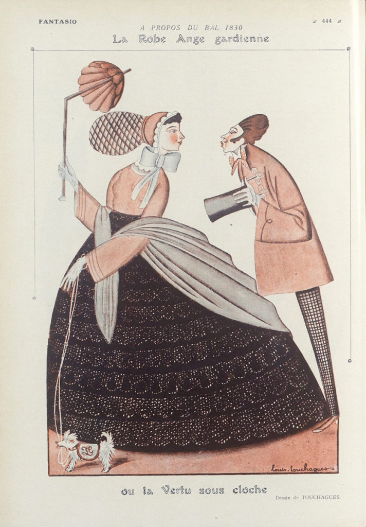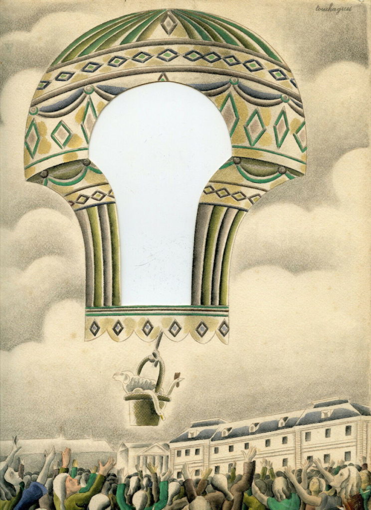 De sa première livraison à Fantasio en 1920, alors qu’il était encore à Lyon, à la dernière en 1926, Touchagues est allé de la saynète Dada au dessin humoristique sophistiqué, en passant par la caricature politique. Ses Saint-Edouard [Herriot] et Saint-Léon [Blum], bourrés de détails à explorer lentement, expriment avec force le positionnement politique de ses cibles dans un style Art Déco.