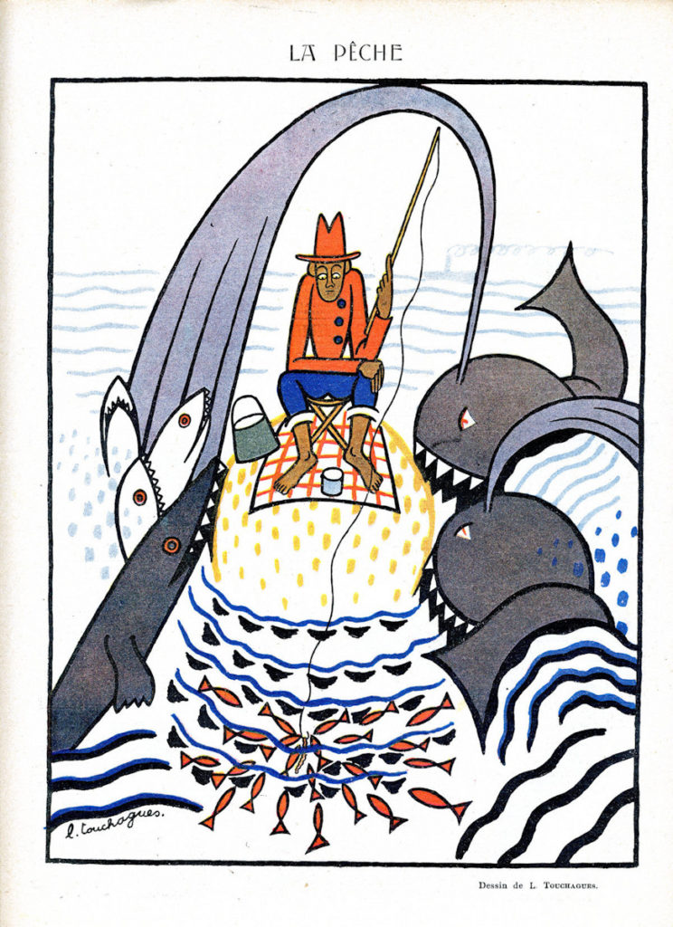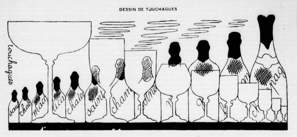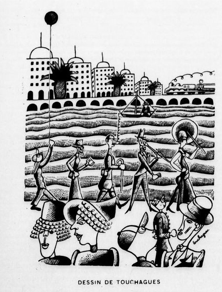 Ci dessous, une sélection de dessins représentatifs de la production de Touchagues dans la première moitié du XXe siècle pour une douzaine de titres. On y trouvera essentiellement des dessins isolés. Les livres et articles de magazines illustrés par Touchagues se trouvent sur d’autres pages.