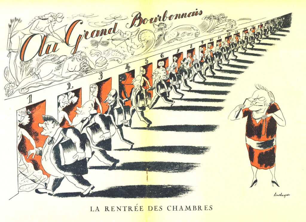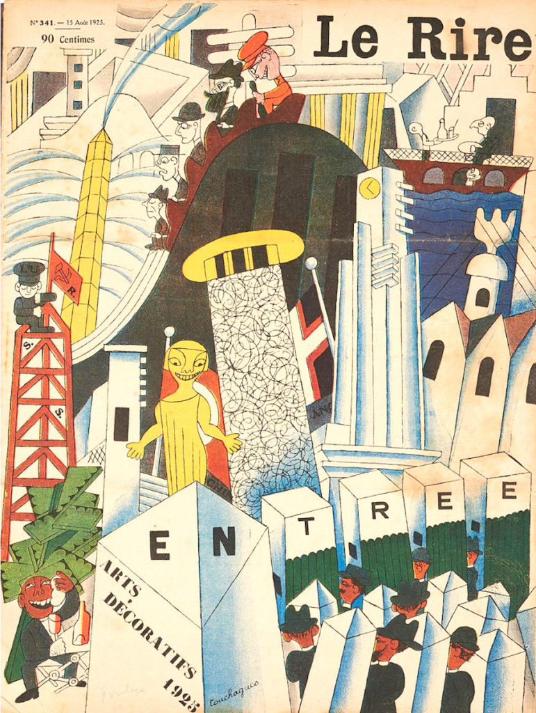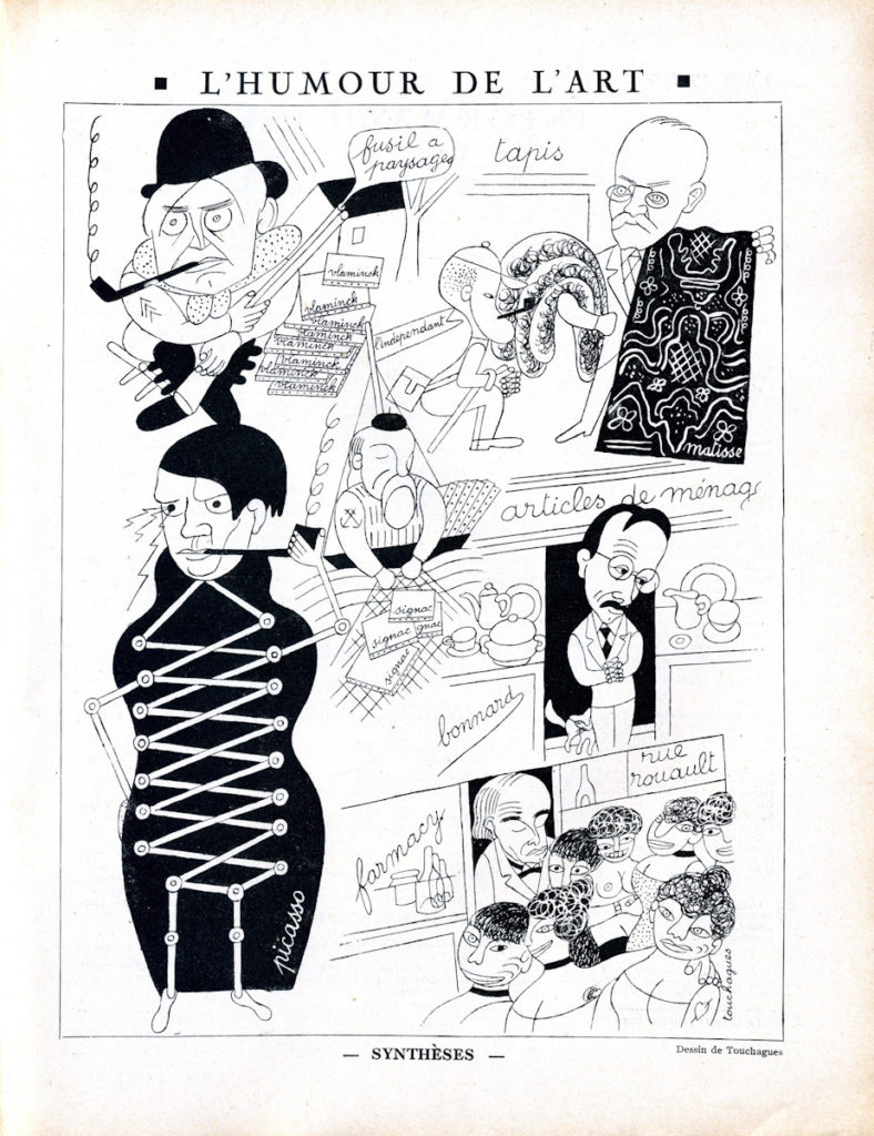 Fondé en 1894 par Félix Juven, Le Rire fut l’hebdomadaire satirique le plus lu de la Belle Époque. La nouvelle série, qui démarre en 1919, dure jusqu’au 1er juin 1940, et compte plus de 1000 numéros. La publication s’interrompt durant l’Occupation. En 1946, Le Rire renaît avec une formule mensuelle qui s’arrête dès décembre 1949. Il y eut ensuite d’autres tentatives de redémarrer le titre jusque dans les années 70 mais Touchagues ne semble pas y avoir contribué. On connaît une vingtaine de dessins de Touchagues publiés dans Le Rire entre son arrivée à Paris en 1922 et 1948. On peut les diviser en trois ensembles :