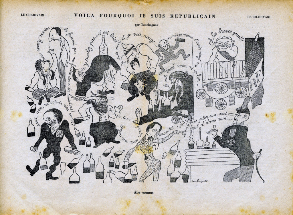 Le Charivari, quotidien politique illustré, fut publié de 1832 à 1926. Une nouvelle série hebdomadaire succède alors au quotidien jusqu’en 1937. Il reparait en mensuel entre 1956 et 1965, puis sous forme trimestrielle jusque dans les années 70. On connaît une dizaine de dessins de Touchagues publiés entre 1926 et 1928 au lancement de la nouvelle série hebdomadaire. Il ne semble pas que Touchagues ait contribué ensuite.