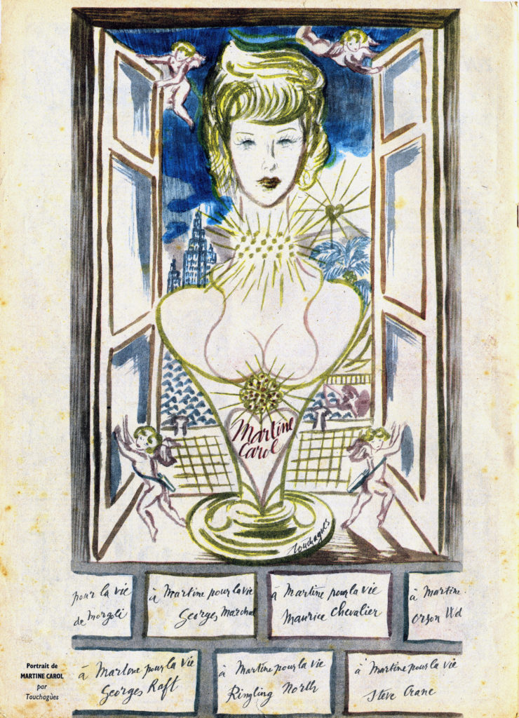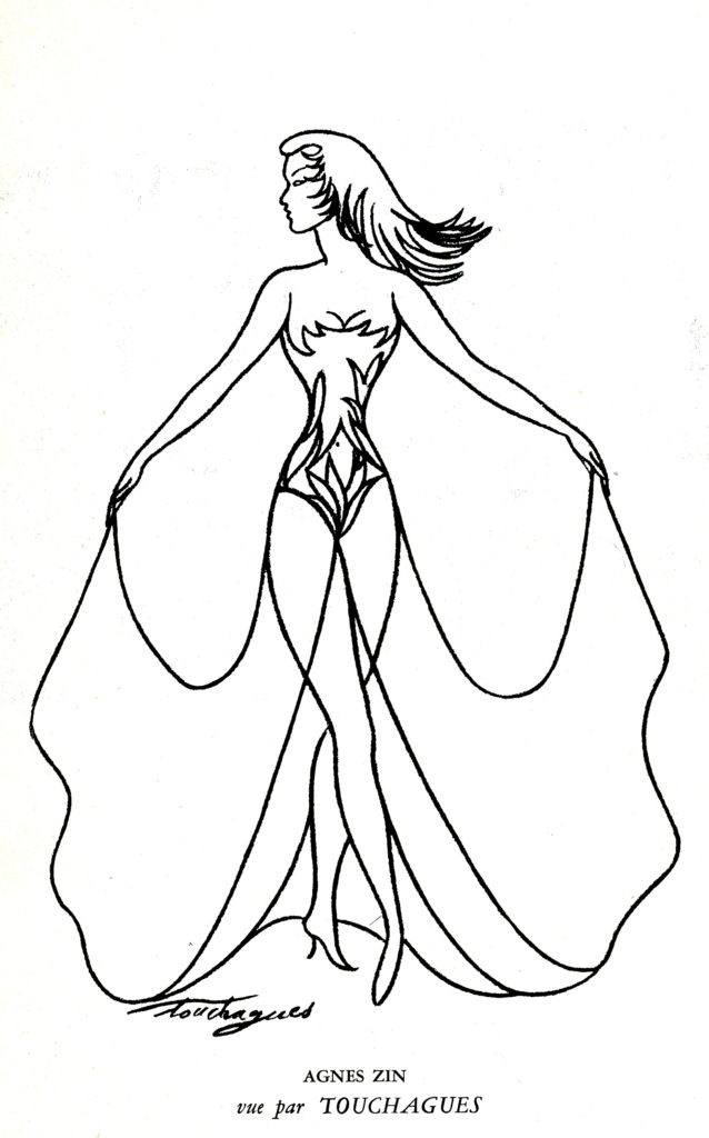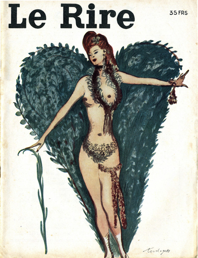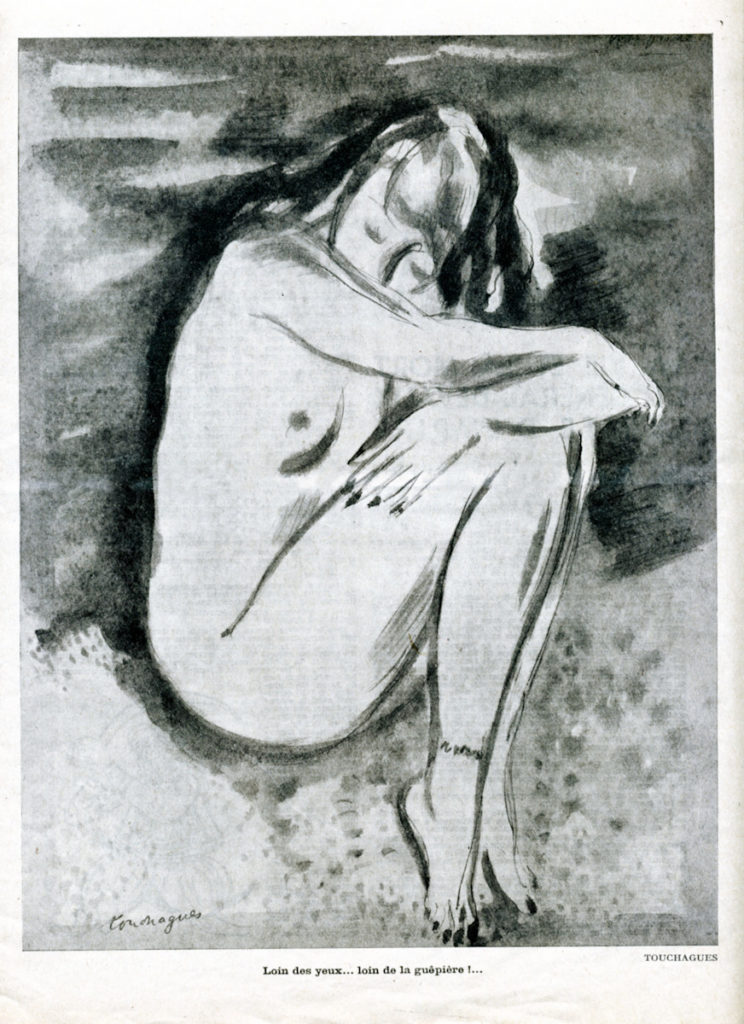 - 1947-1948. La femme. Touchagues a acquis une image de « peintre de la femme » en publiant plusieurs recueils de dessins de nus et en illustrant de nombreux livres de dessins érotiques. La rédaction du Rire tire parti de cette réputation en lui demandant d’illustrer ses couvertures ou certaines pages intérieures avec des dessins de femmes dénudées, censées attirer l’attention du passant. Cela ne durera qu’un temps …