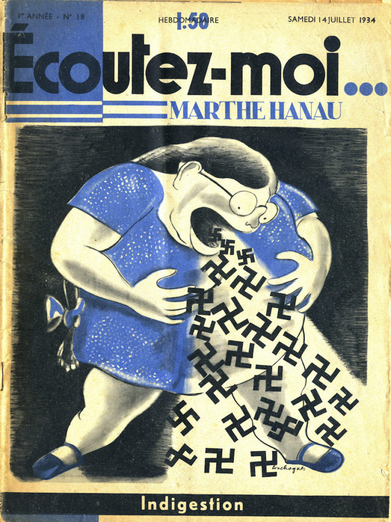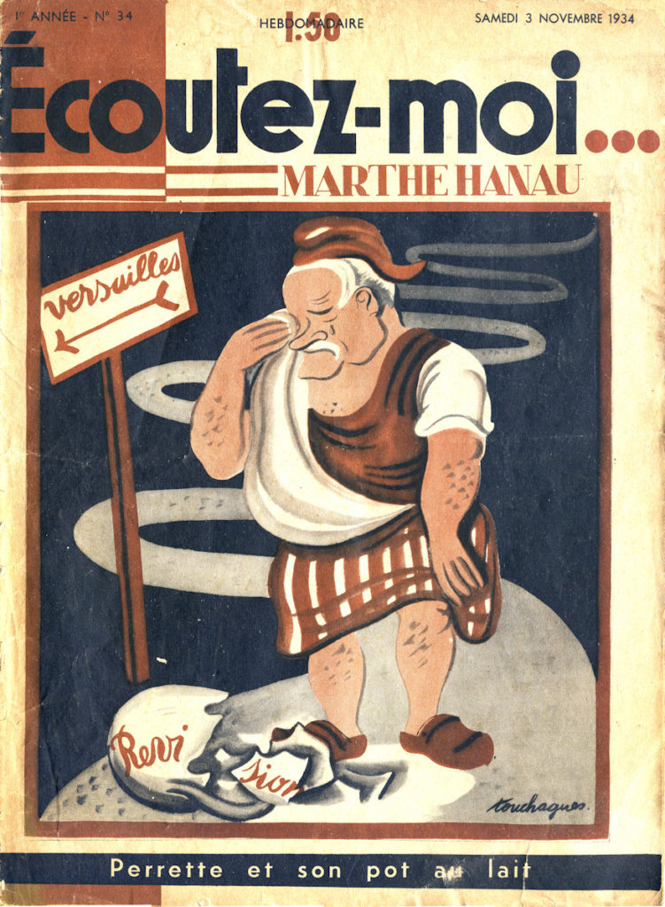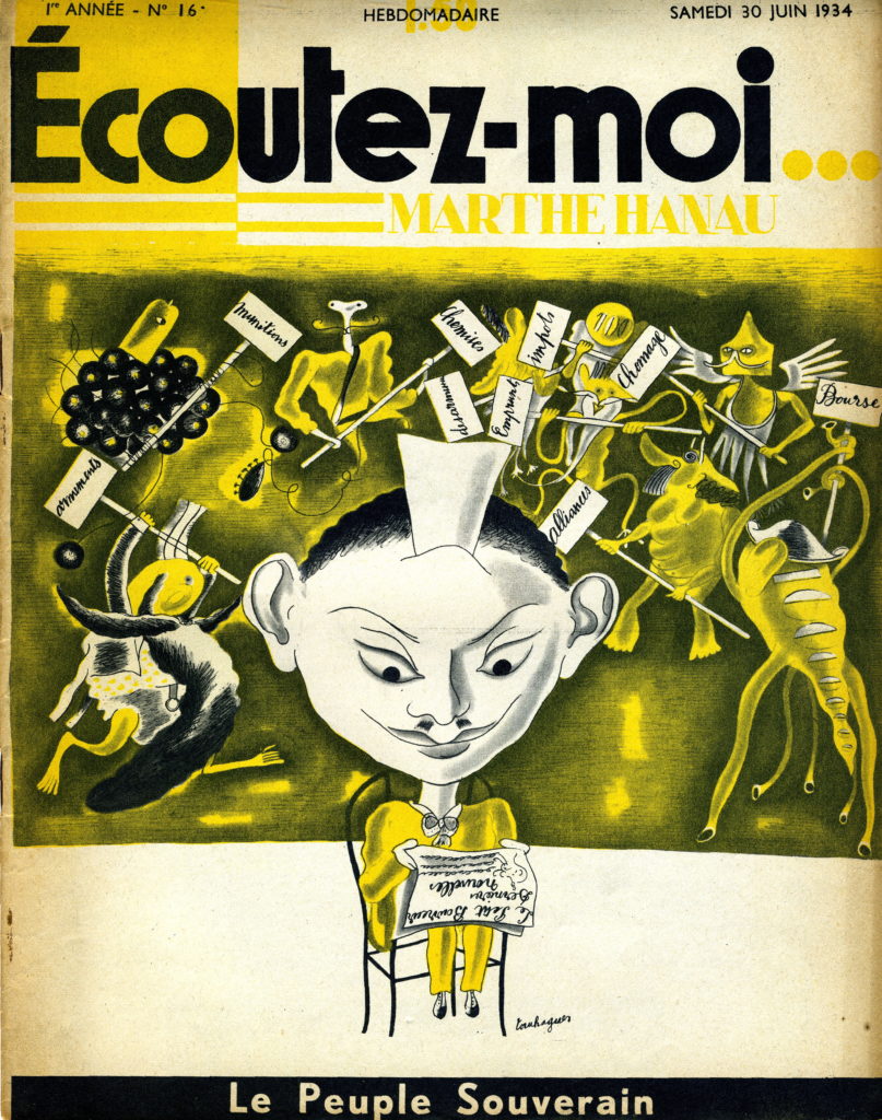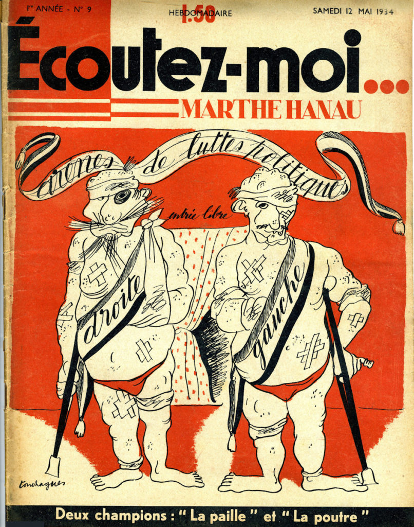 En mars 1934, encore libre, Marthe Hanau lance son dernier hebdomadaire, Écoutez-moi…, avec des dessinateurs de renom : Effel, Touchagues et Kisling. Ce périodique a une ligne éditoriale pacifiste, attaque les juges et met en garde contre Hitler. Il disparaît en février 1935 après cinquante numéros, rattrapé par les condamnations de sa patronne. Touchagues a fourni des dessins pour pratiquement tous les numéros, certains dans la ligne antiparlementaire qu’il avait déjà suivie dans Le Charivari dans les années 20, d’autres pour illustrer les historiettes des pages centrales.