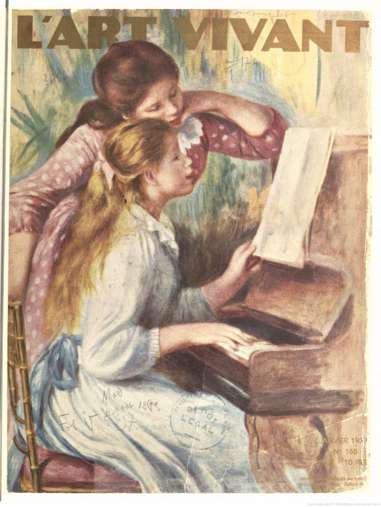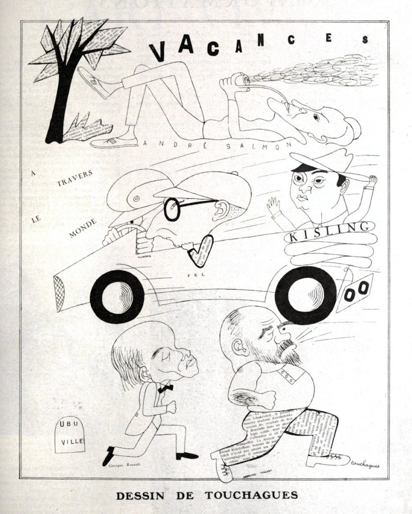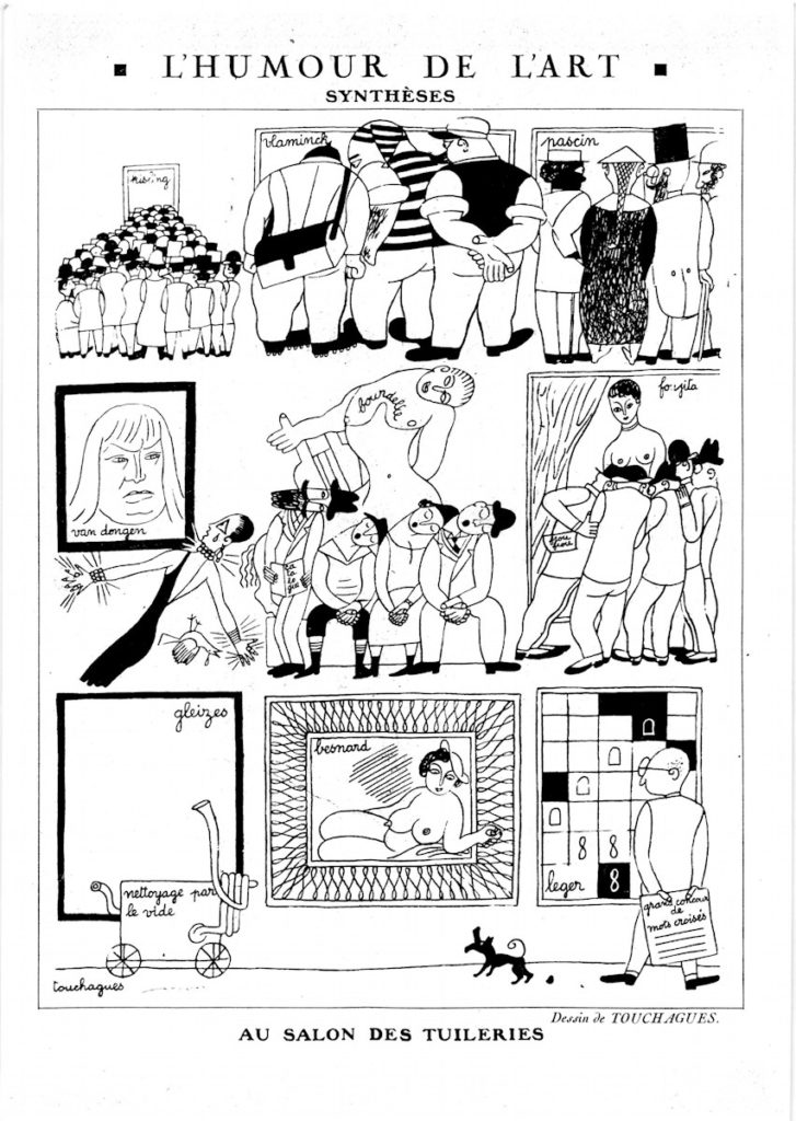 L’Art vivant : revue bimensuelle des amateurs et des artistes… Telle est la ligne éditoriale de lancement de ce nouveau titre le 1er janvier 1925. Des auteurs de talent comme Georges Charensol et Georges Hilaire y écrivent des articles fouillés où ils critiquent l’art académique et vantent les mérites de certains nouveaux venus comme Touchagues. Ces articles incluent des images de bonne qualité des œuvres. Grace à cette vitrine, l’art si particulier de Touchagues à cette époque – qui utilise toutes les ressources de la gouache – est peu à peu reconnu et apprécié. Cependant, Touchagues n’oublie pas le dessin et produit entre 1925 et 1927 quelques images humoristiques fortes qui ciblent le monde de l’art parisien et qui seront éditées en pleine page. On lui confiera aussi, mais c’est plus anecdotique, la première couverture couleur en quadrichromie de la revue en 1933. Cette image, un peu fade, sera la dernière qu’il dessinera pour l’Art Vivant. La revue continuera à publier des commentaires, plutôt bienveillants, sur la production artistique de Touchagues jusqu’en 1938.