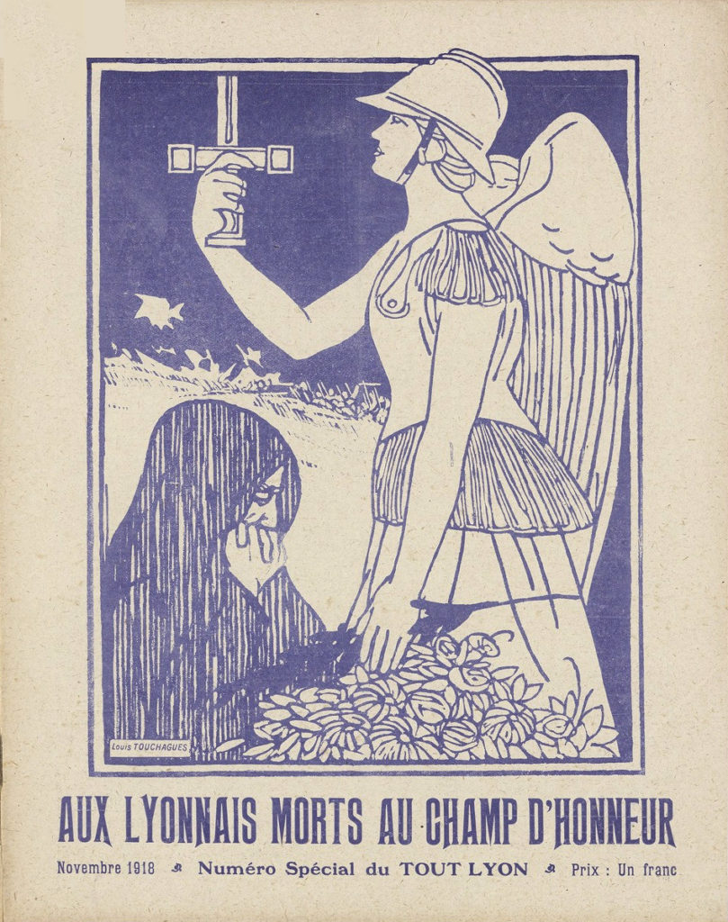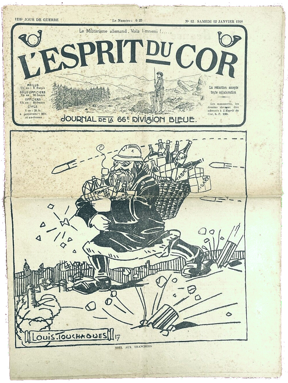 L’esprit du cor, journal de la 66e Division Bleue est un journal de tranchée qui a été publié de façon assez aléatoire entre 1917 et 1919. La couverture était illustrée par un dessin en noir et blanc. Touchagues qui avait été réformé suite à un accident sur le champ de manœuvre juste avant la première guerre mondiale, servait alors dans les hôpitaux annexes de l’Hôtel-Dieu de Lyon. En 1917, il dessina un « Noël aux tranchées » qui fut publié en couverture du numéro 12.