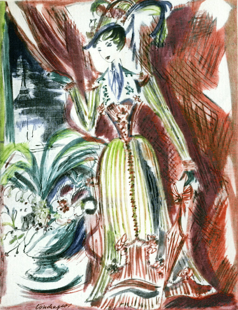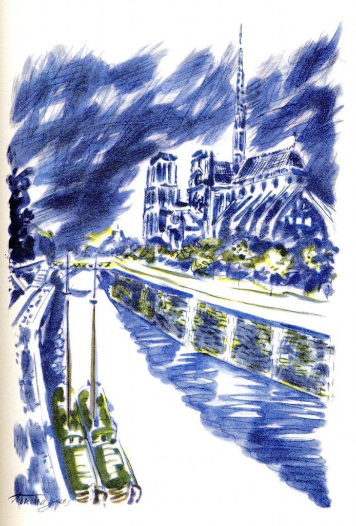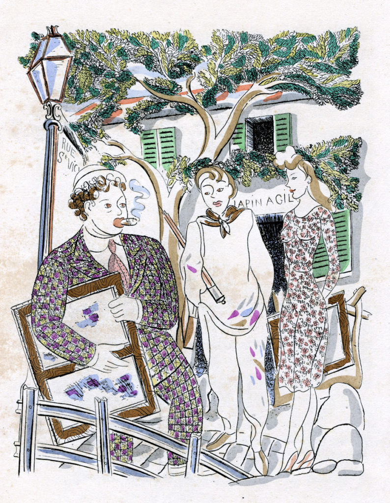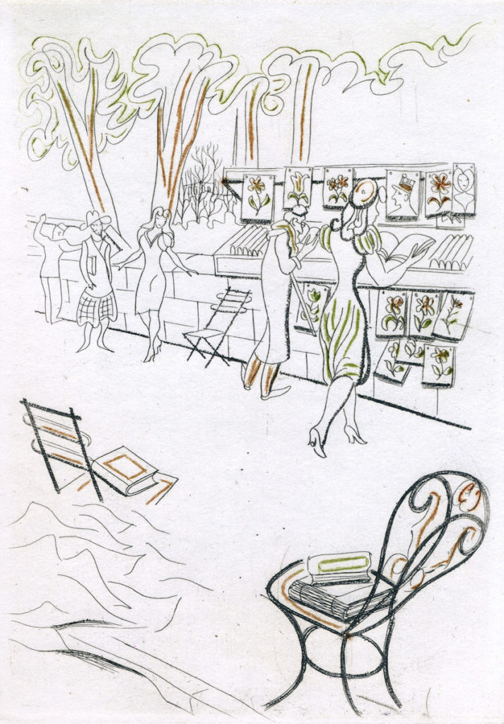 Colette, revenue de l’Exode, se réinstalle en octobre 1940 dans son appartement du Palais Royal. Chaque jour, depuis sa fenêtre (elle est gravement handicapée par l’arthrite), elle observe l’Occupation au quotidien à Paris. Ecrivaine adulée, elle écrit pour le Petit Parisien des chroniques sur les restrictions, le marché noir, le système « trucs et trocs », l’entraide qui réunit les habitants du Palais-Royal, les distractions, les rares expositions, le petit peuple de Paris, les animaux et les privations auxquelles eux aussi sont soumis… Ces chroniques s’arrêtent en décembre 1941, avec l’arrestation de son 3ème mari. Organisées en 11 parties, elles constituent le « Paris de ma fenêtre » qui sera édité à Genève en 1944 avec une préface de Francis Carco. De multiples rééditions suivront. Celle qui nous intéresse sera publiée en 1951 en édition de luxe illustrée par Touchagues avec 12 gravures sur cuivre en couleur et 24 en noir.