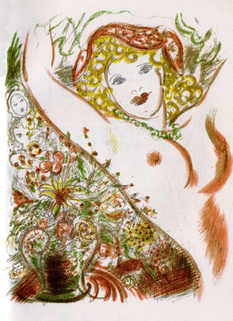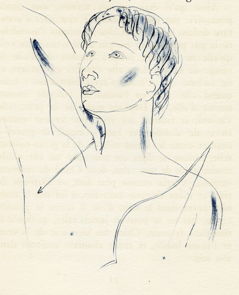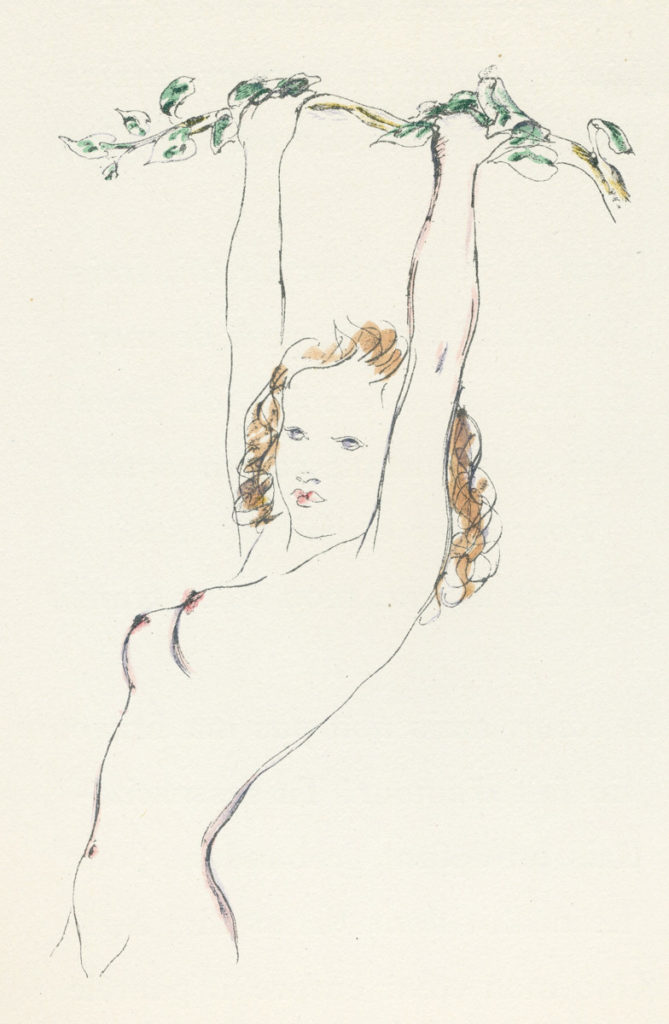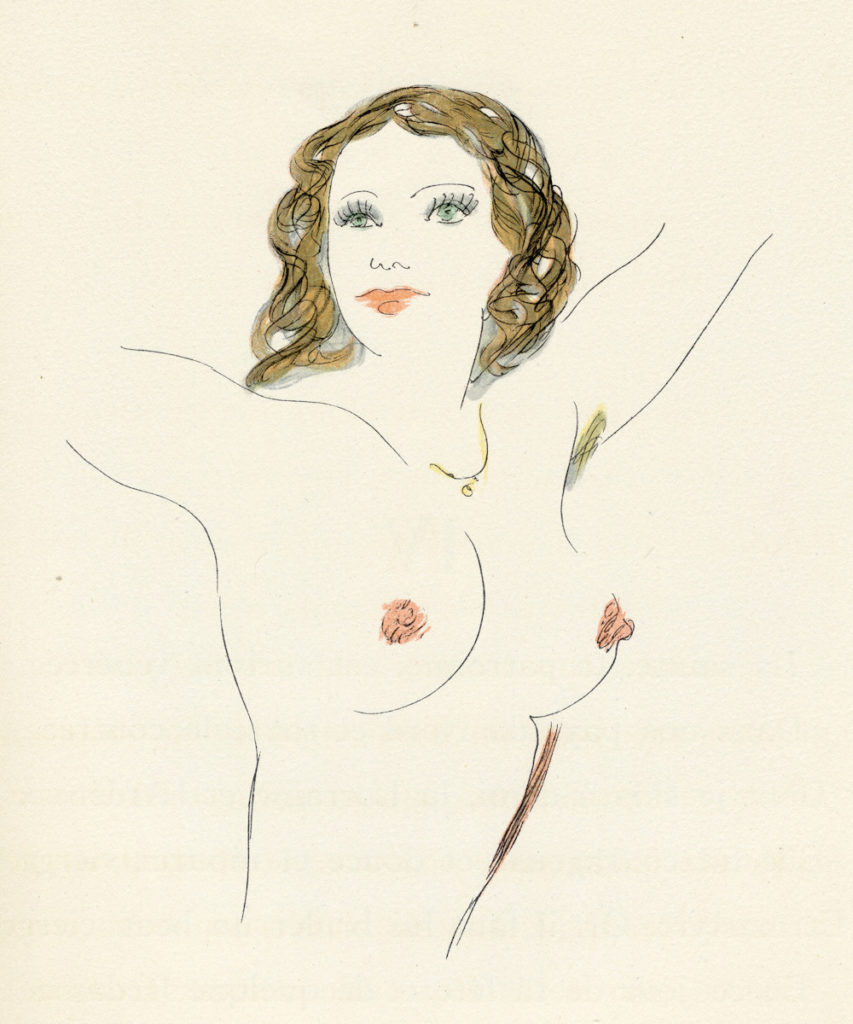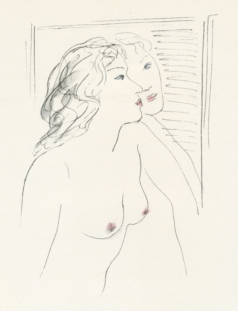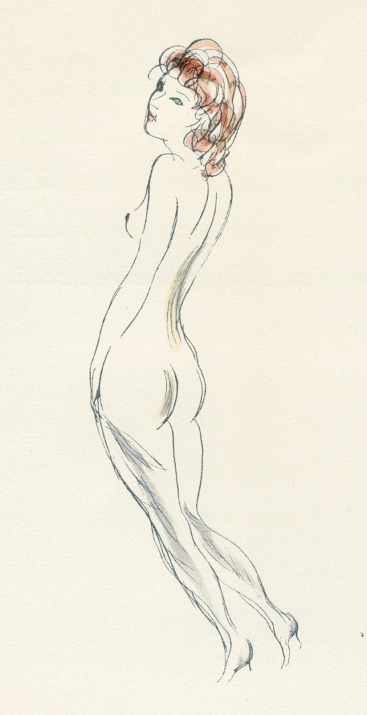 Probablement pour contenir les coûts d’un tirage à 2000 exemplaires, l’impression est en photogravure ; ceci permet de publier quelques images en couleur mais on perd la finesse des images à l’eau forte ou les nuances de la lithographie. Voici quelques exemples de dessins de l’album, les nus au trait d’abord, d’autres images ensuite.
