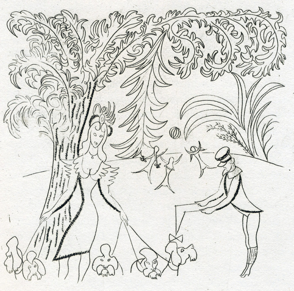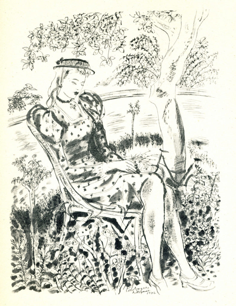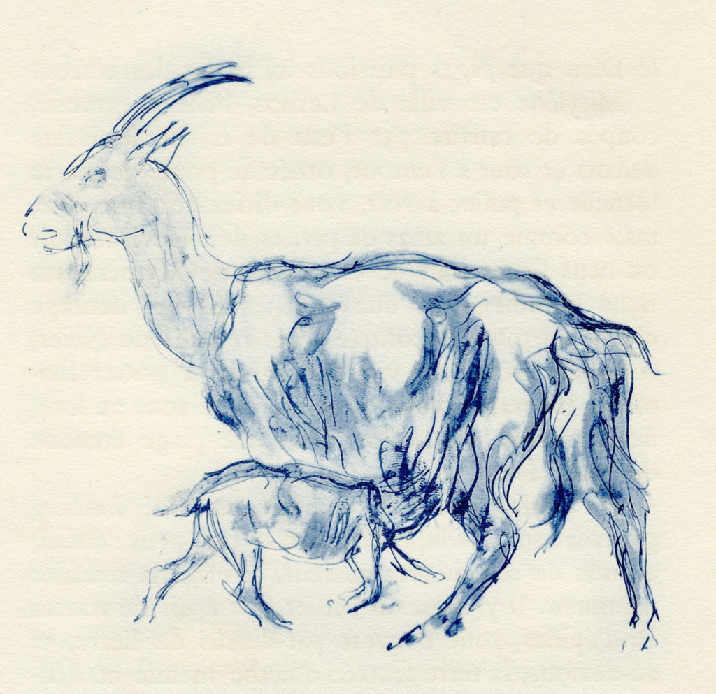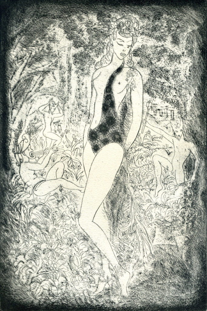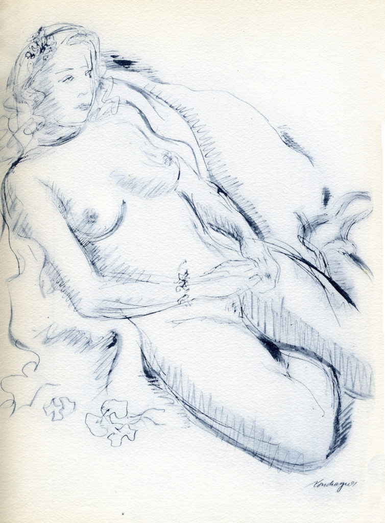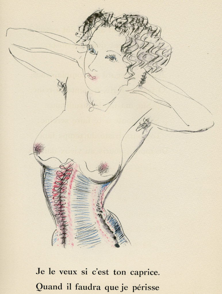 Probablement pour contenir les coûts d’un tirage à 2000 exemplaires, l’impression est en photogravure ; ceci permet de publier quelques images en couleur mais on perd la finesse des images à l’eau forte ou les nuances de la lithographie. Voici quelques exemples de dessins de l’album, les nus au trait d’abord, d’autres images ensuite.
