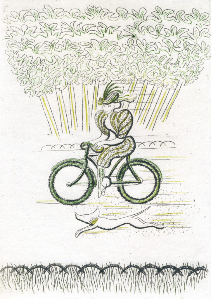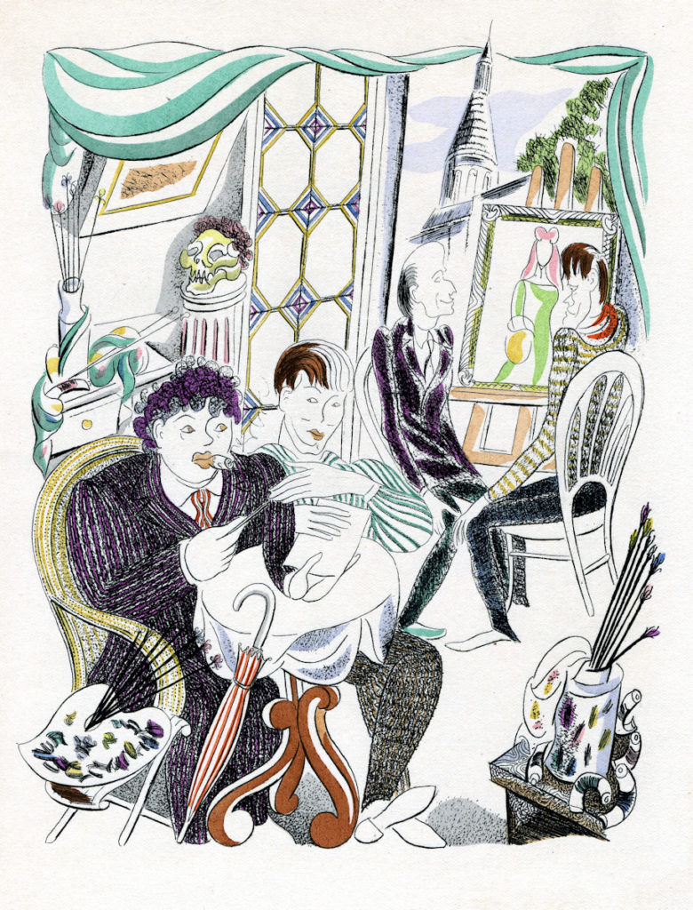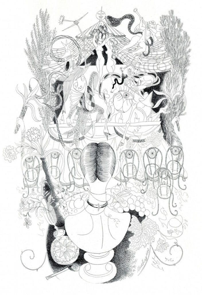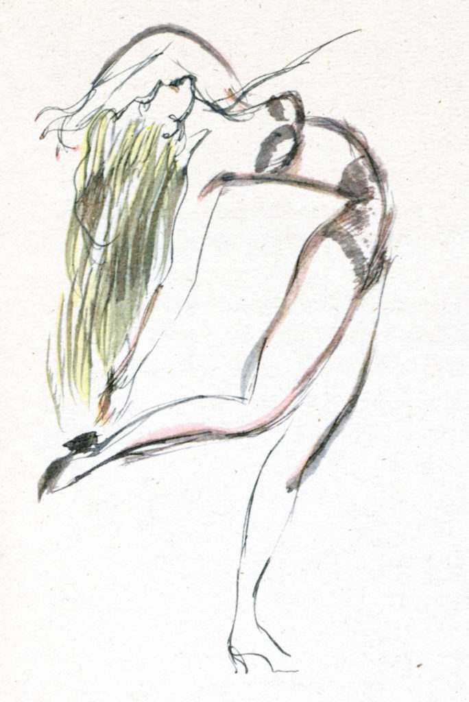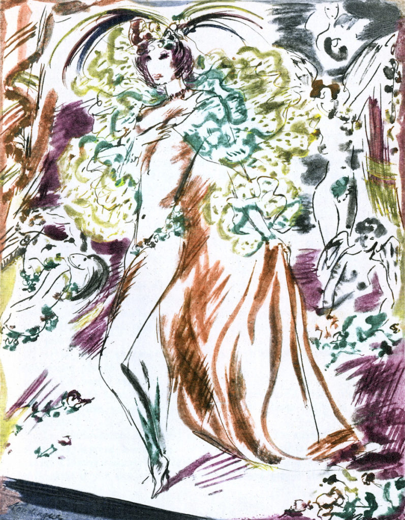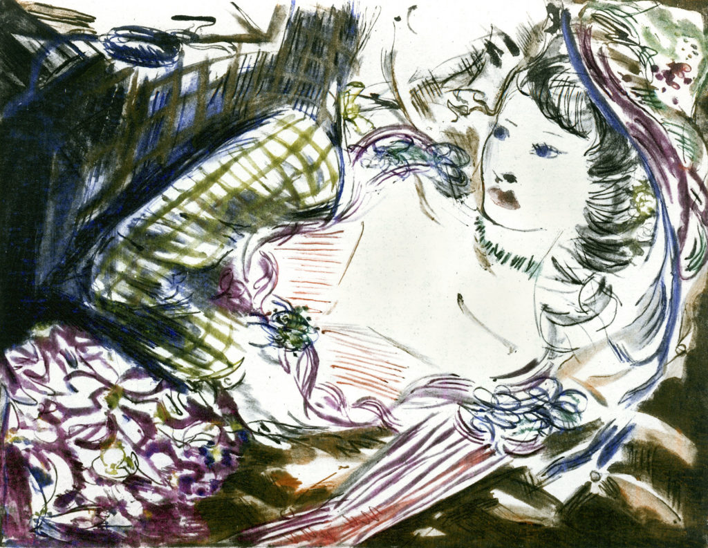 Probablement pour contenir les coûts d’un tirage à 2000 exemplaires, l’impression est en photogravure ; ceci permet de publier quelques images en couleur mais on perd la finesse des images à l’eau forte ou les nuances de la lithographie. Voici quelques exemples de dessins de l’album, les nus au trait d’abord, d’autres images ensuite.