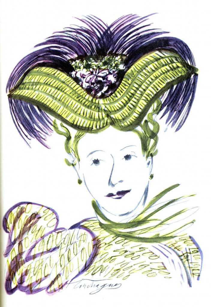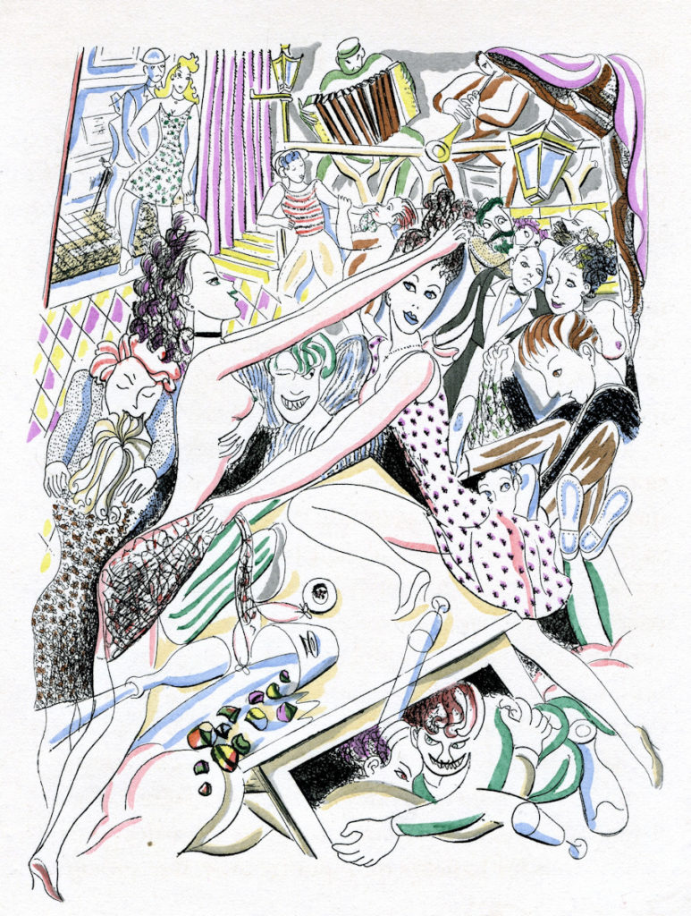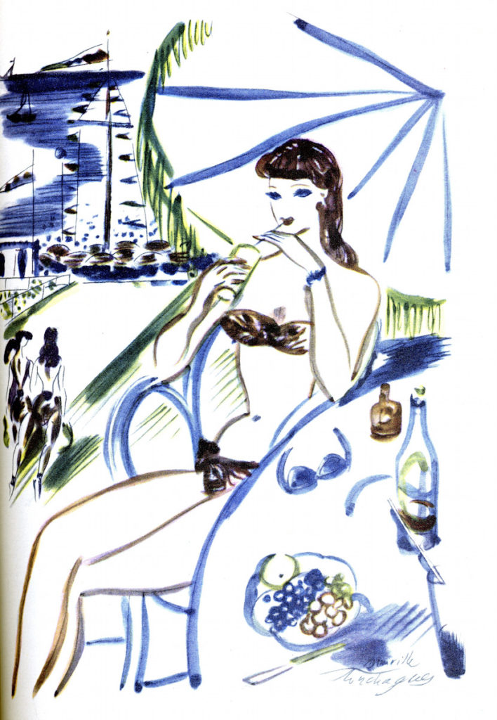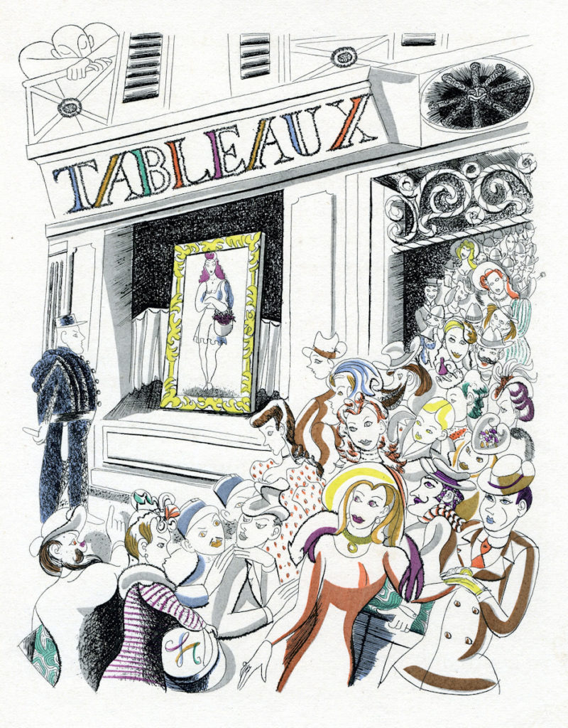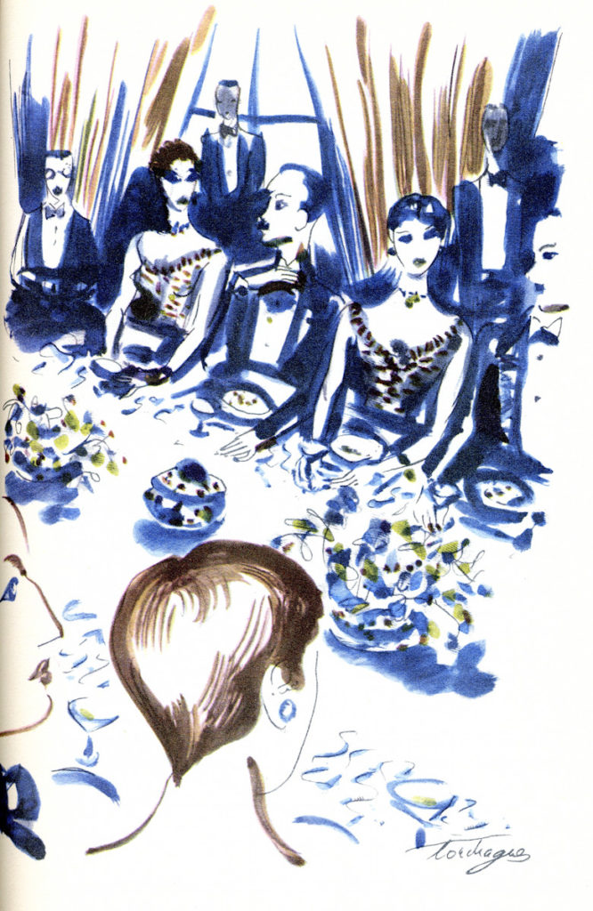 Jean Pierre Dorian brosse là une fresque du « Tout Paris » de la fin des années 40. Il le fait au travers de petites anecdotes au charme désuet où il saisit les situations dans lesquelles les acteurs de ce microcosme passent de fête en spectacle à travers l’Europe, s’interpellent et se jaugent. Touchagues y est parfaitement à l’aise et produit 15 dessins à l’aquarelle et à la plume qui seront imprimés en photogravure. Le style des dessins est proche de celui des dessins qu’il avait publiés dans « Amour chef-lieu Paris » deux ans auparavant. Touchagues a utilisé ici une charte graphique à deux couleurs assez inhabituelle : détails en jaune-vert ou brun sur décors bleu foncé. Certains dessins se rapportent au texte, d’autres non. Touchagues semble avoir repris ici certains dessins anciens qu’il a passé en couleur. Le texte, plutôt élégant, a un intérêt historique indéniable, tant le nombre de personnages mis en scène est grand. Voici quelques unes des images :