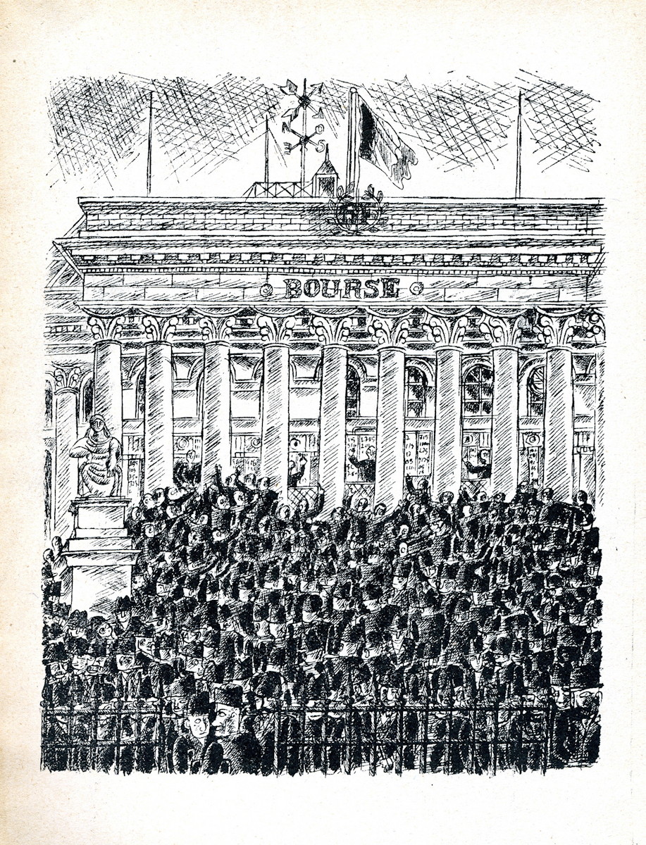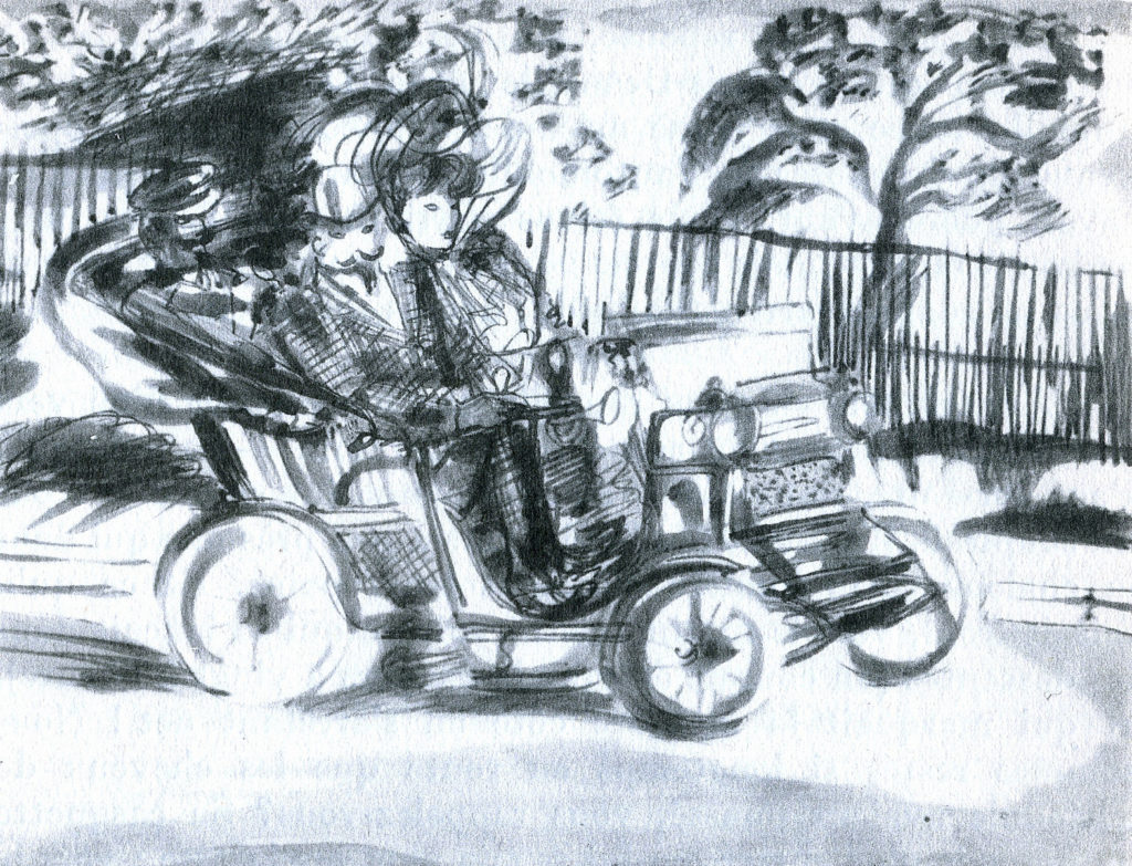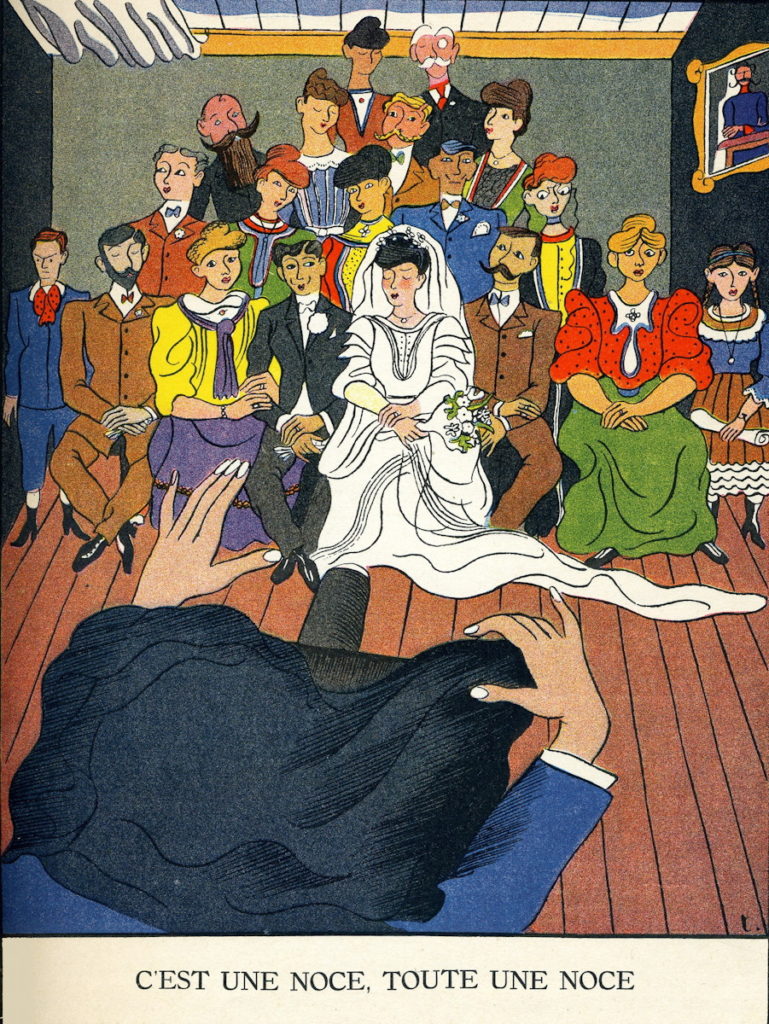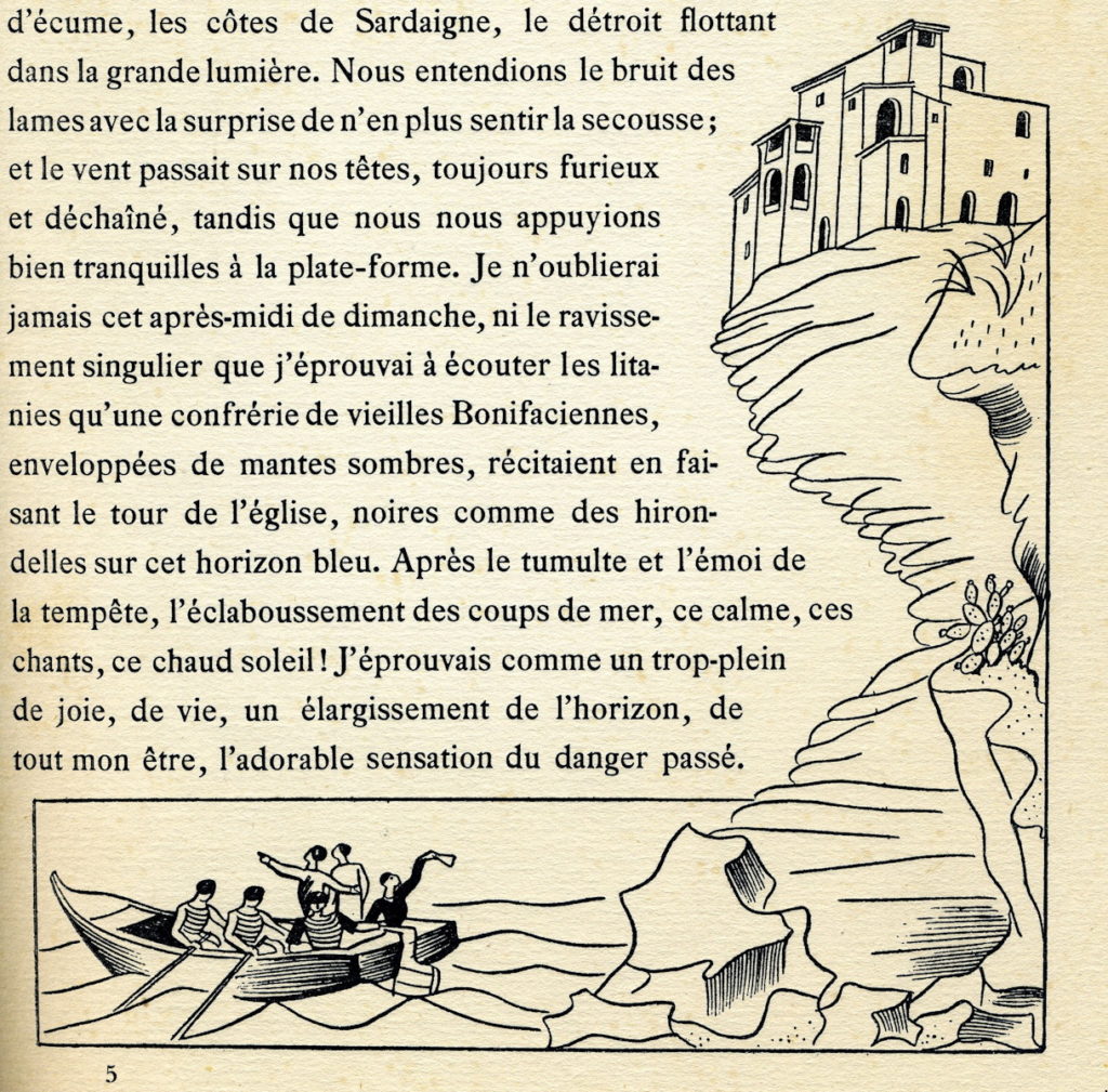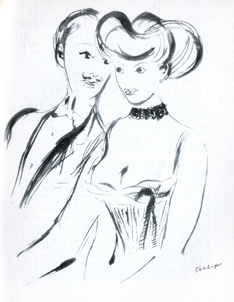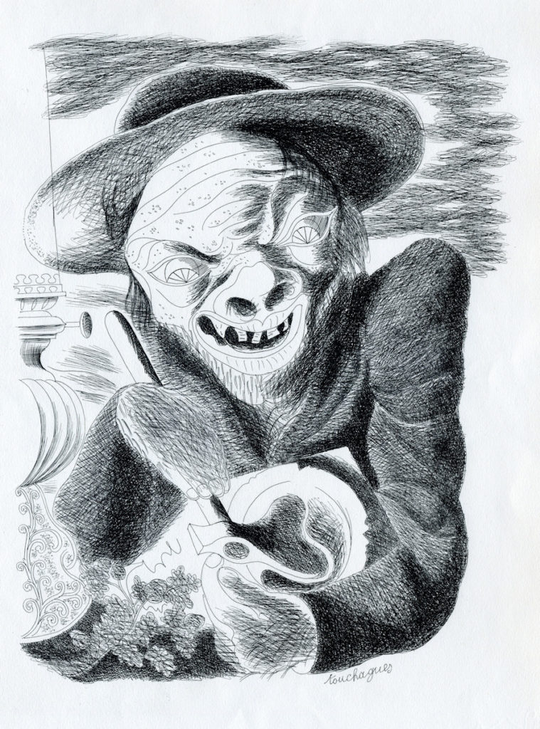 Pour ce livre, Touchagues a également dessiné des images en noir et blanc qui ont été intégrées au texte. La réalisation est là aussi de grande qualité. On est loin du dessin rapide des caricatures politiques et qu’il produisait en série à la même époque. En voici trois :