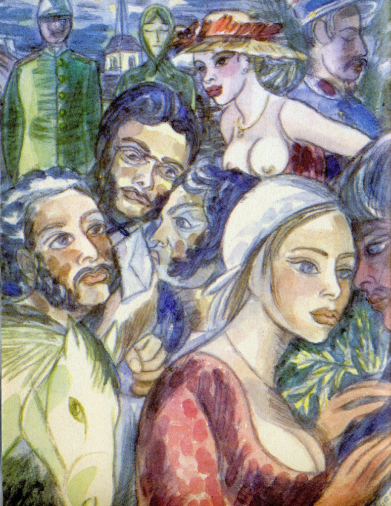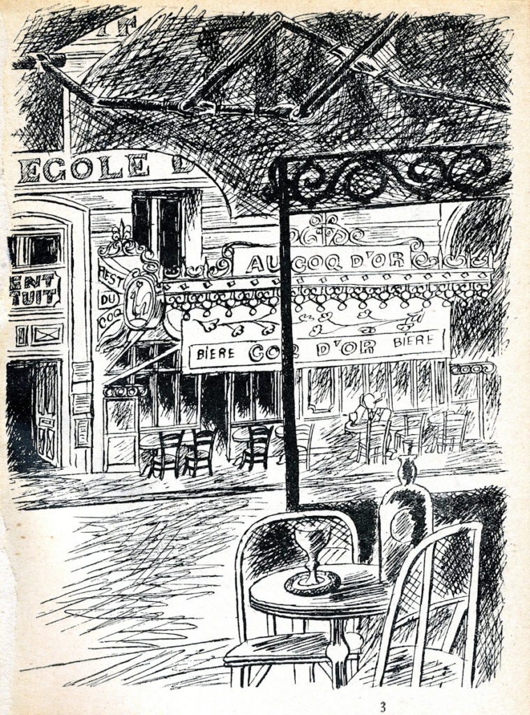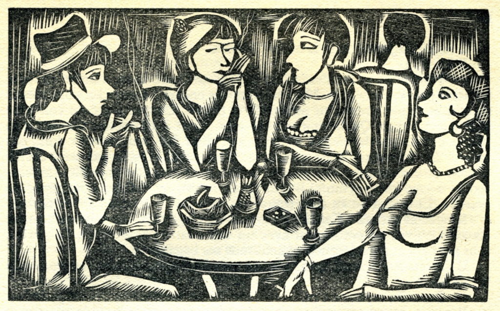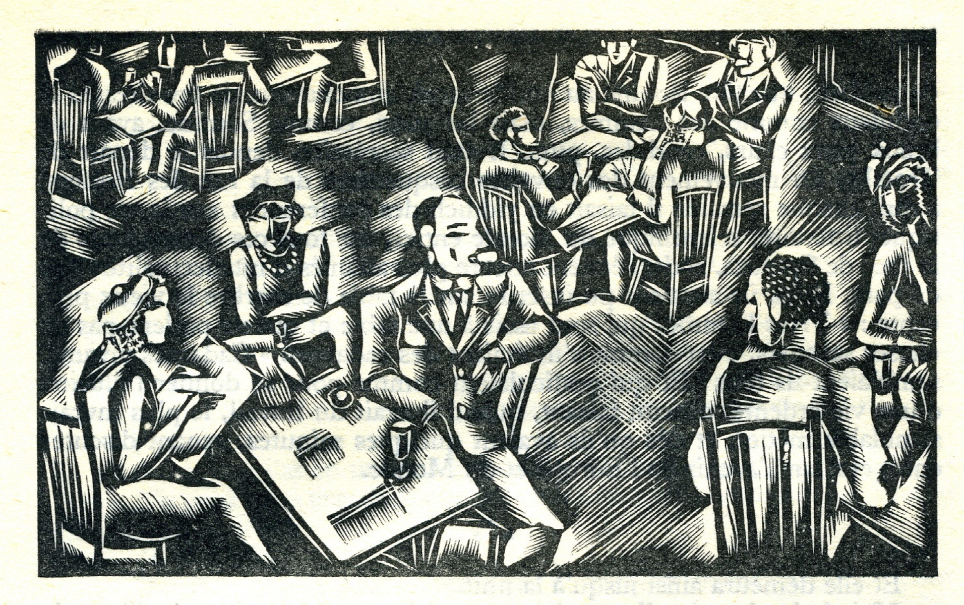 A partir de 1910, beaucoup de peintres parisiens quittent Montmartre et la rive droite pour la rive gauche à Montparnasse. Le quartier est encore champêtre et la vie y est peu chère et facile pour des artistes désargentés. En 1929, Michel Georges-Michel, peintre, journaliste et romancier y publie la première version de son roman « Les Montparnos, roman illustré par les Montparnos » qui met en scène ce groupe de peintres qui vont révolutionner la peinture contre l’impressionnisme et les Fauves. Touchagues y apparaît en tant que membre du groupe et y dessine une gravure à l’estompe du Café du Dôme. Plus tard, en 1933, il illustre seul une nouvelle édition chez Arthème-Fayard pour laquelle il produit 34 bois gravés originaux. Ces gravures sont plus abouties et variées que celles qu’il avait dessinées pour le roman « Un Parfum d’Aventure » publié en 1925 dans la revue « Demain ». Bien qu’il ait réussi les illustrations en bois gravé de ce livre, cette technique ne sera jamais sa préférée. Elle demandait probablement trop de temps pour arriver au résultat souhaité alors qu’un dessin au crayon ou à l’encre ne demandait que quelques minutes. Touchagues était un homme pressé ! Voici un échantillon de ce que l’on peut trouver dans « Les Montparnos » ; d’abord une galerie de portraits puis deux images de cafés.