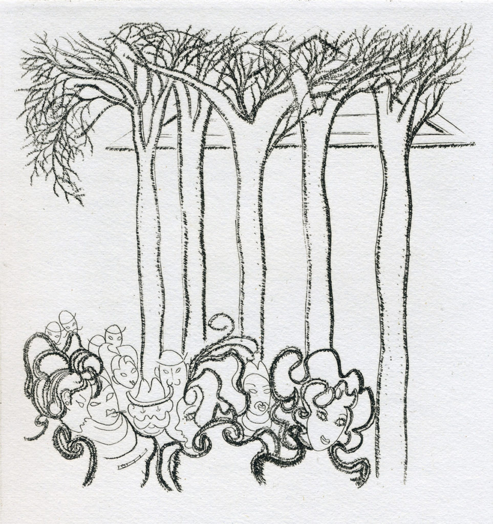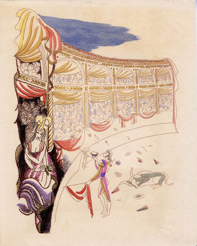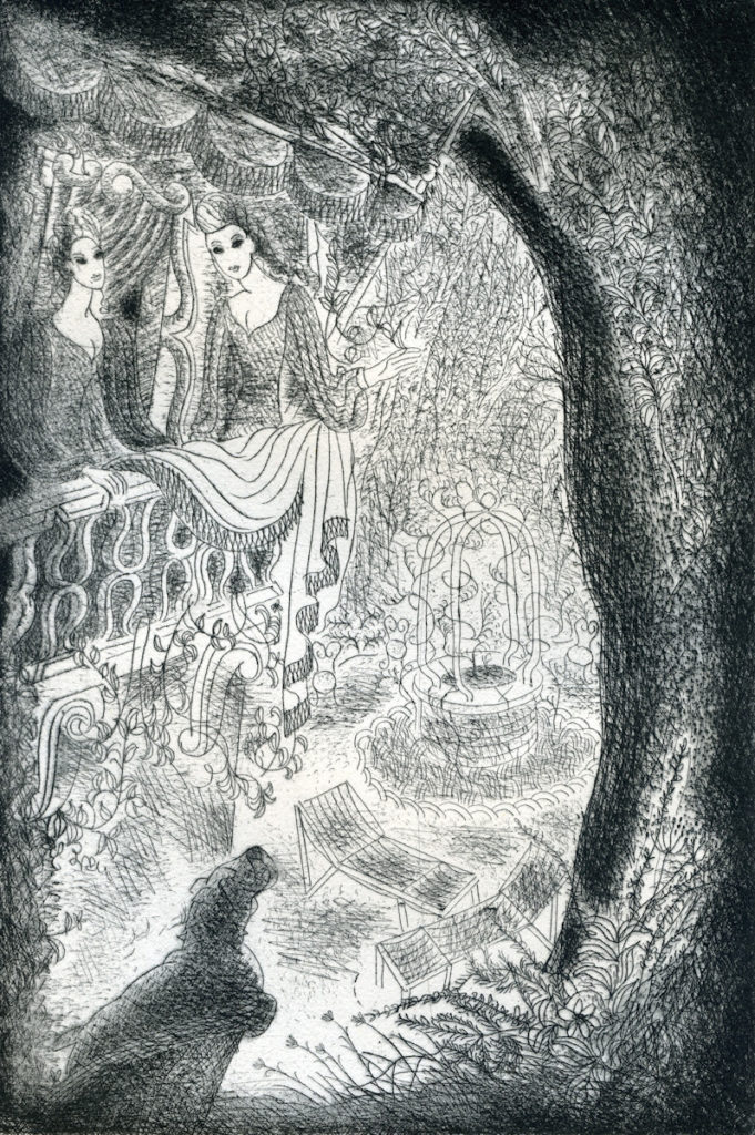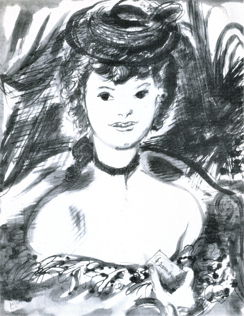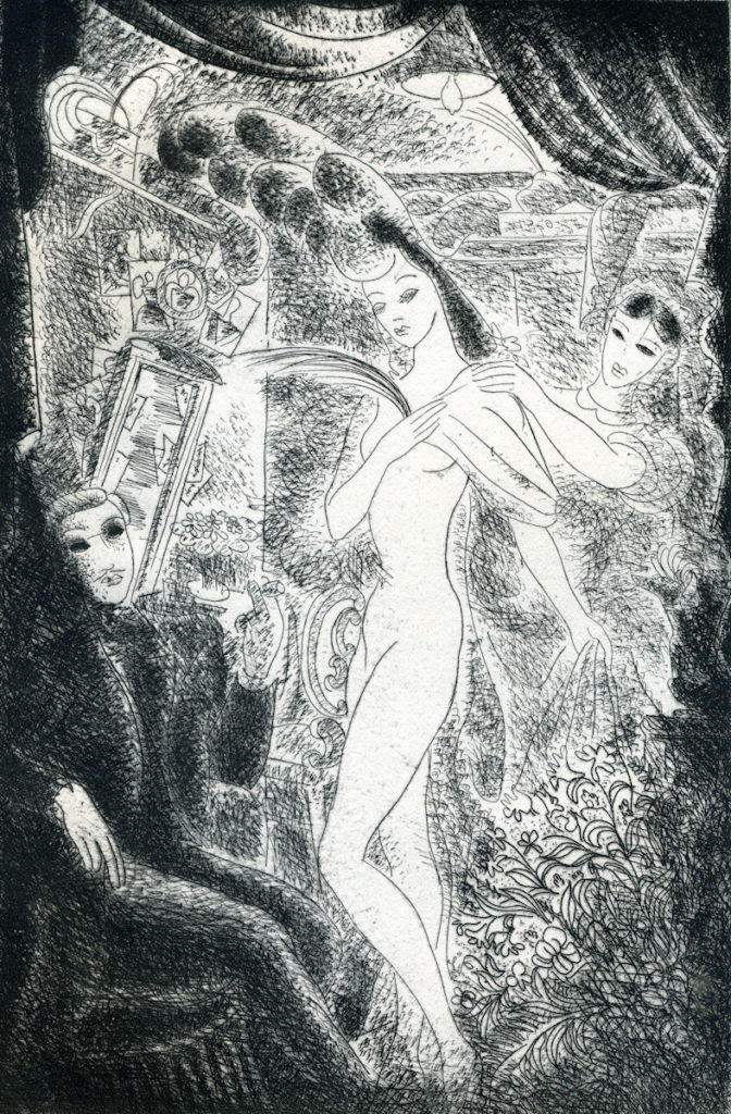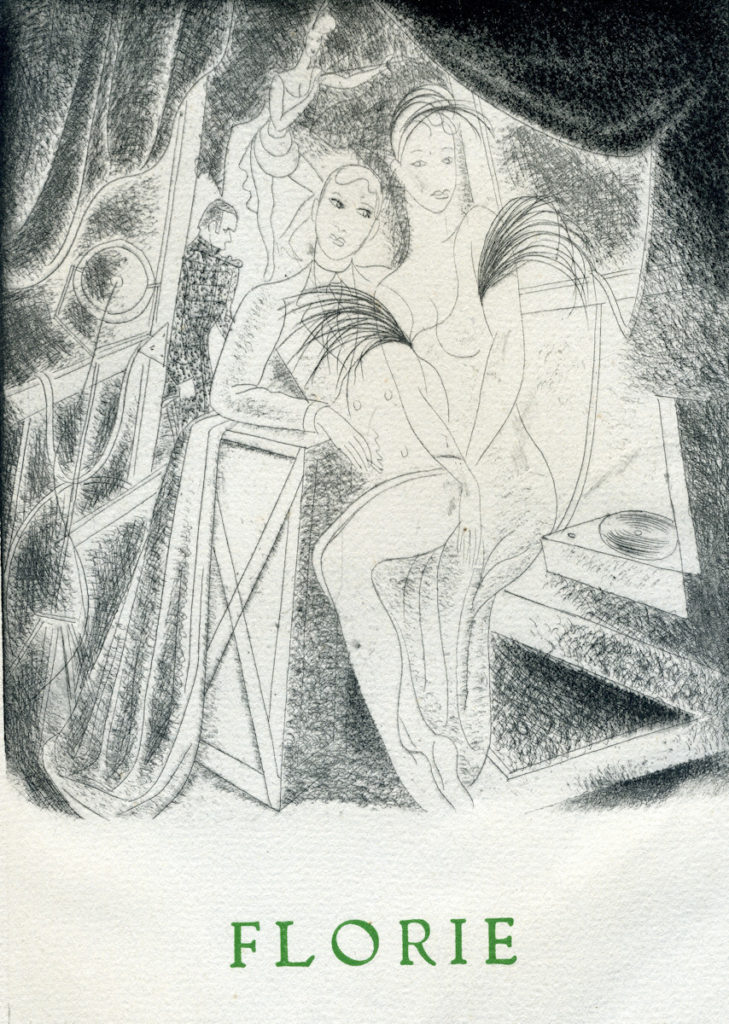 La grande Colette publia ce petit livre divisé en deux parties (Florie et Rivalité) en 1946 aux Editions La Joie de Vivre. L’action de Florie se situe dans les coulisses d’un music hall dont Florie est la vedette. Celle de Rivalité met en scène deux jeunes femmes gravitant autour de Bussy, auteur de théâtre à succès. Touchagues a dessiné 10 eaux-fortes (5 + 5) au trait noir (avec de légers accents gris) pour ce livre d’art tiré à 1000 exemplaires. L’ambiance générale des gravures est plutôt crépusculaire avec d’épais rideaux noirs encadrant les scènes et une foule de détails fins qui remplissent toute la zone imprimée. Il faut prendre une loupe pour lire certaines zones. Quelques exemples ci après :