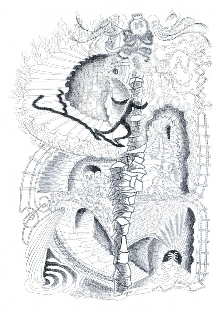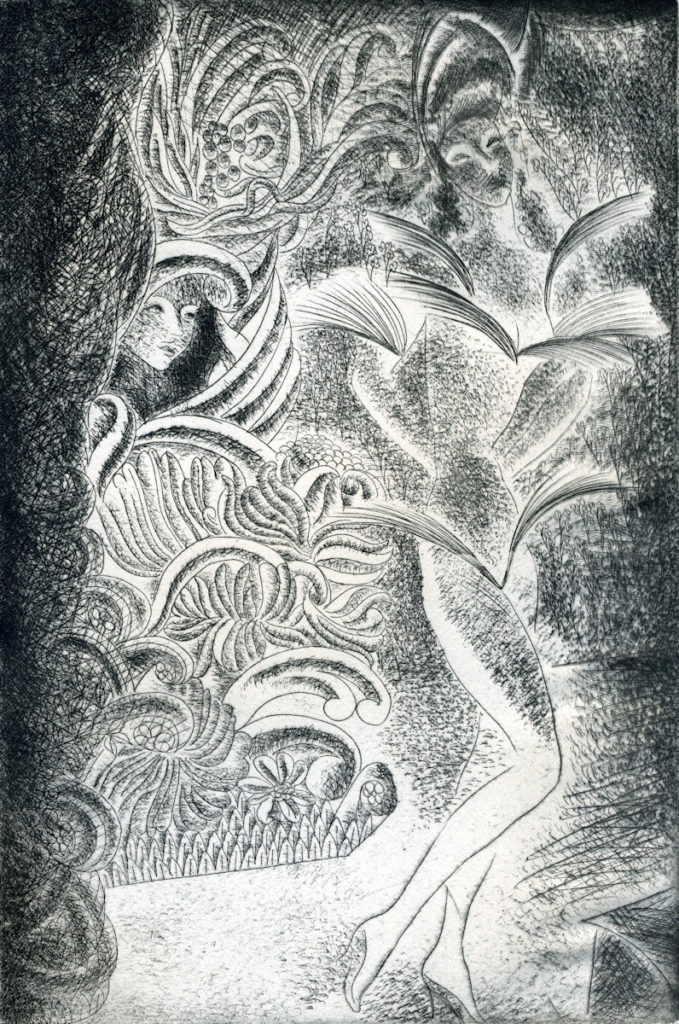 Anarchiste pacifiste, engagé volontaire en 1914, Marcel Sauvage a appartenu à la génération des tranchées de la Première Guerre mondiale. Poète très influencé par Max Jacob et André Salmon, il a collaboré à de nombreux journaux et revues, travaillé comme grand reporter à L’Intransigeant, et a été apprécié comme critique d’art et critique littéraire : il sera membre du jury du prix Renaudot de 1927 à 1981. Il publie en 1946 ce roman fantastique et onirique « Je me suis joué la comédie » qui sera publié en édition d’art à 250 exemplaires seulement avec 6 eaux-fortes de grand format de Touchagues. Touchagues réussit là l’exploit de transcrire les cauchemars du héros de ce roman obscur en quelques eaux-fortes assez réussies qui reprennent les détails du texte. Ces images au trait noir, sans accents de gris, sont moins confuses que celles du Florie de Colette édité la même année. Malheureusement, un tirage confidentiel et un auteur à la signature peu connue les feront rester sous les radars des biographes de Touchagues. En voici trois :