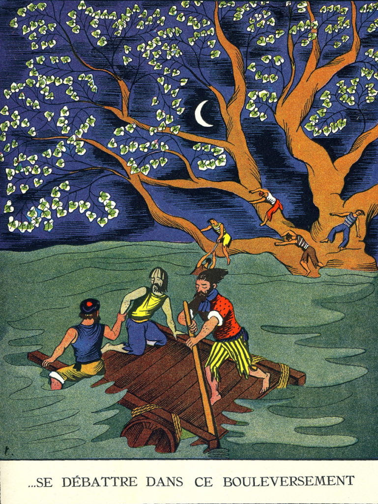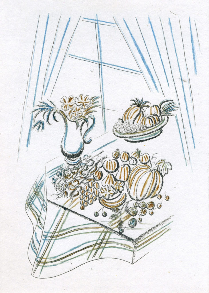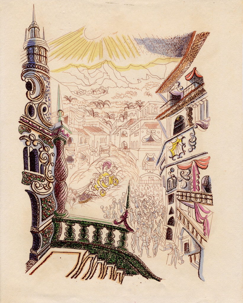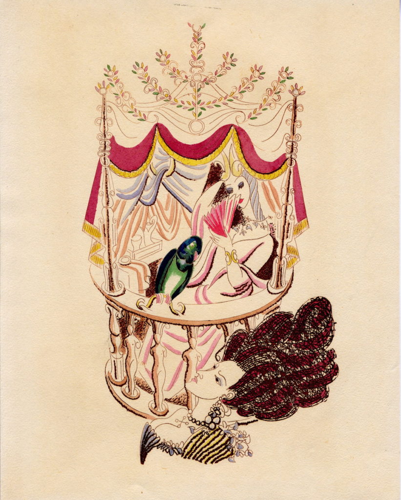 Cette édition originale, publiée en janvier 1947, a été illustrée par un Touchagues inspiré qui a dessiné 10 belles eaux-fortes originales aux traits fins rehaussées de couleurs au pochoir. On est bien sorti de la guerre ; les gravures aux accents de couleurs vives, comme l’histoire joyeuse, incitent à l’optimisme. En voici quelques exemples :