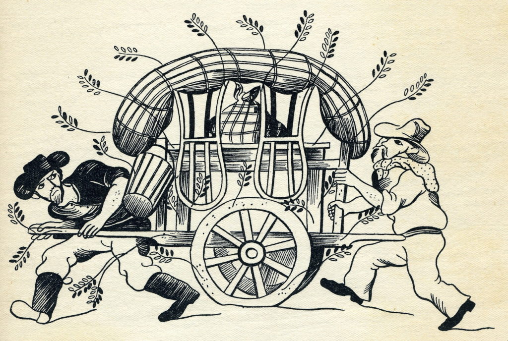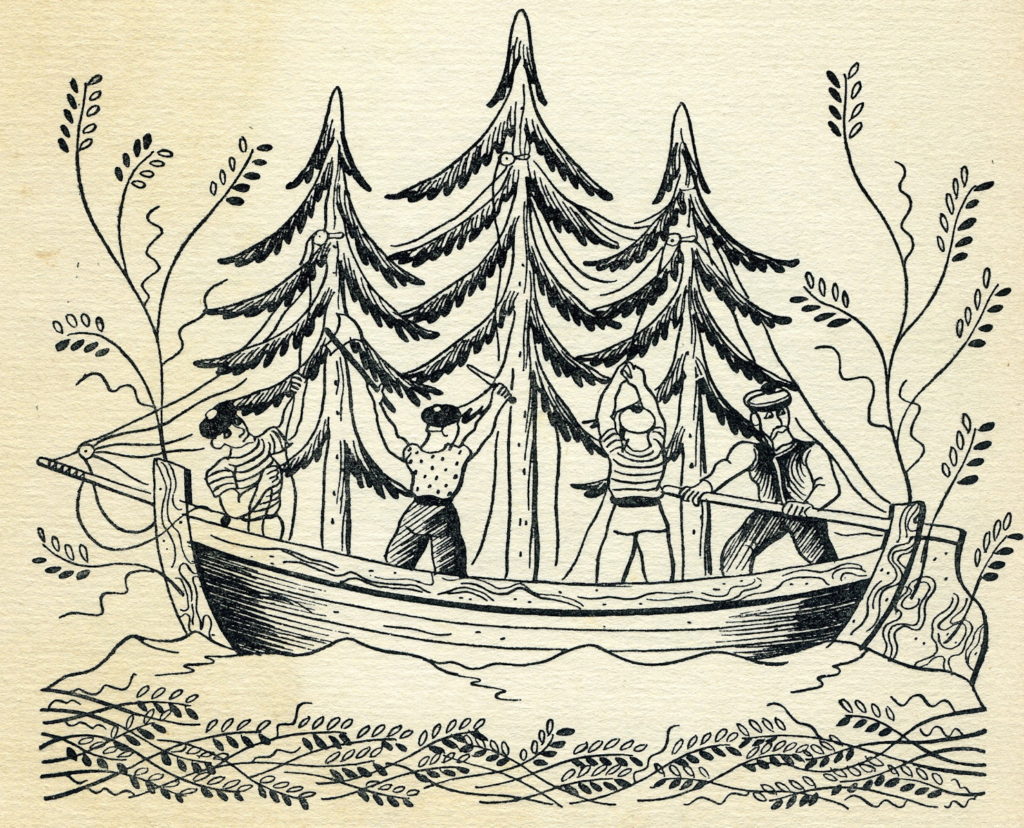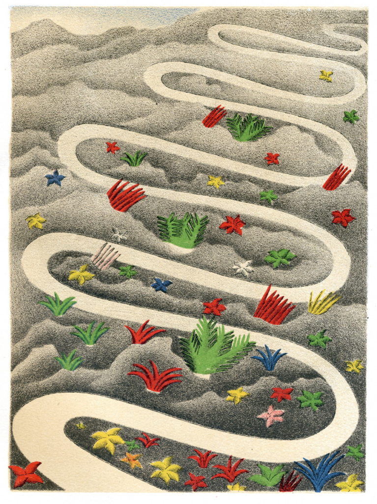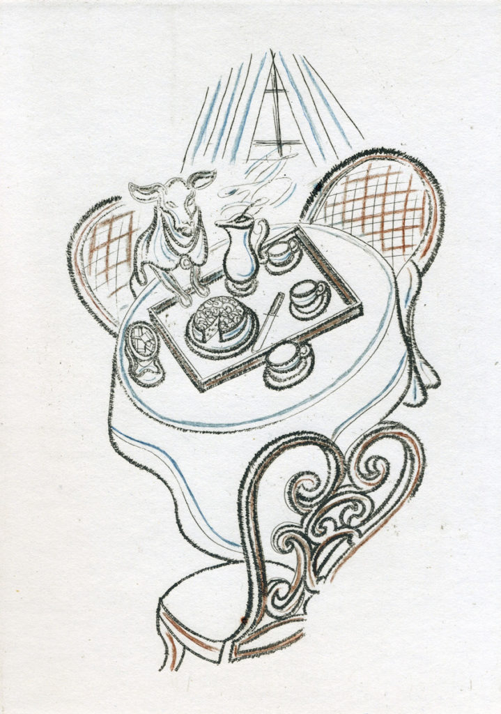 Cette édition originale, publiée en janvier 1947, a été illustrée par un Touchagues inspiré qui a dessiné 10 belles eaux-fortes originales aux traits fins rehaussées de couleurs au pochoir. On est bien sorti de la guerre ; les gravures aux accents de couleurs vives, comme l’histoire joyeuse, incitent à l’optimisme. En voici quelques exemples :