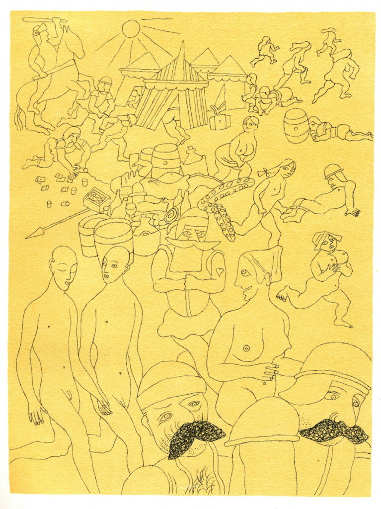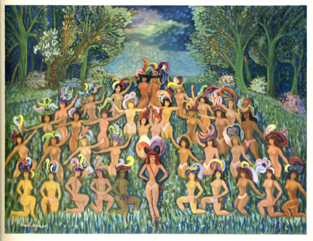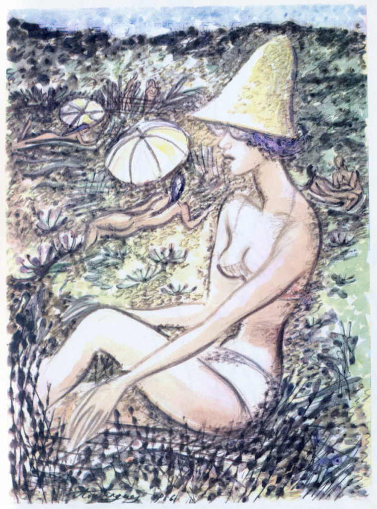 Touchagues tire profit de ce scénario léger pour peupler ses lithographies de nus féminins, certains assez filiformes, d’autres plus en chair, dans un environnement pastoral. Le trait est plus épais mais moins dense que dans ses précédentes illustrations et les couleurs chaudes omniprésentes. On est clairement dans le sud … Il faut noter que le Grand Eunuque Taxis réapparaîtra plusieurs fois dans ses œuvres ultérieures en tant que pasteur sur les plages de Saint Tropez