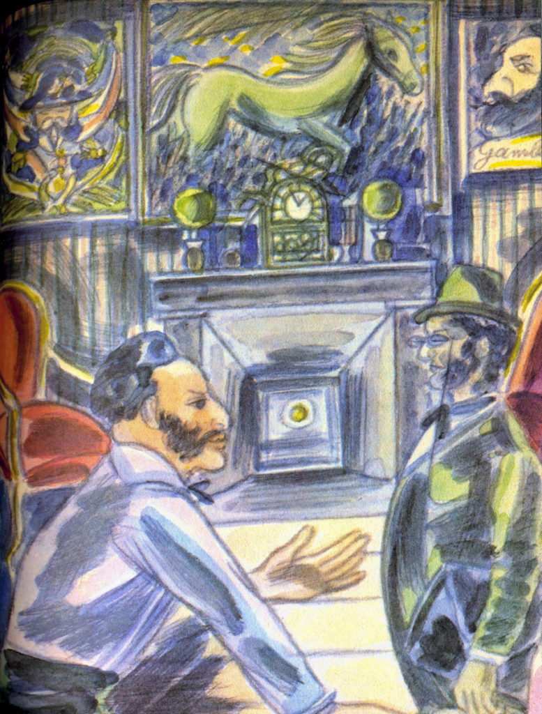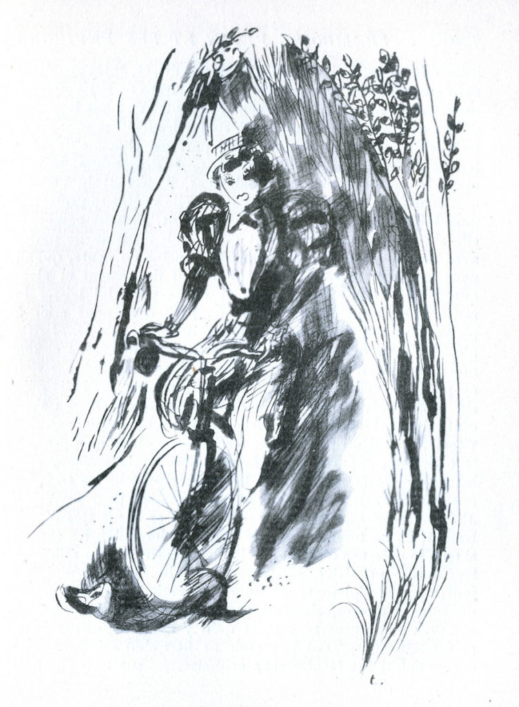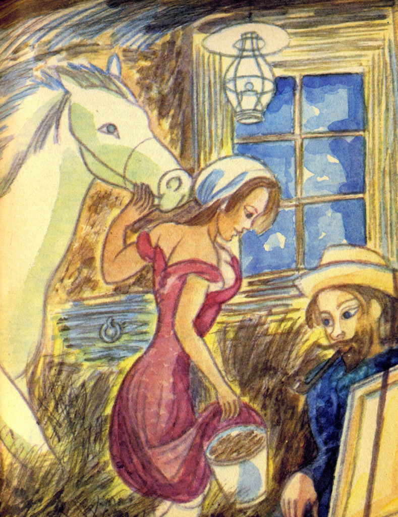 Cette chronique paysanne gaillarde de Marcel Aymé sent bon le terroir. On y voit s’affronter les deux familles Haudouin et Maloret, rivales pour l’éternité depuis le « viol » de la mère Haudouin par un soldat prussien pendant la guerre de 1870. Marcel Aymé dépeint le village au travers des mœurs sexuelles de ses habitants. La jument verte, morte prématurément, observe la scène depuis le tableau où elle est maintenant confinée. Personnage à part entière du roman, elle ne se prive pas de faire des réflexions sur les mœurs douteuses de ce petit monde. Pour cette édition à grande diffusion, Touchagues, qui approche les 80 ans, a produit 8 images « pleines » à l’aquarelle en pleine page. Elles collent bien au récit, sont réalistes et plutôt sages. On y voit bien quelques pointes de sein … Il n’avait jusque là que rarement utilisé ce style dans ses illustrations de livres. L’éditeur a malheureusement rogné certaines images pour l’impression en photogravure. C’est le dernier travail d’illustration de livre par Touchagues que nous connaissons