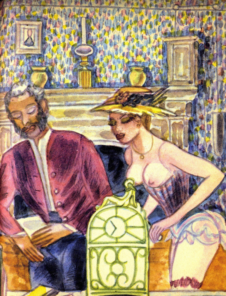 Il s’agit d’un roman de mœurs écrit par François de Bondy, romancier et critique littéraire né en 1875. L’histoire se déroule à la Belle Epoque dans un monde de casinos et de restaurants où l’argent file plus vite qu’il ne rentre. Son personnage central, Adalbert (son avatar ?), y vit une sorte de vaudeville déstructuré avec Françoise Pépin. Louis Touchagues se saisit de cette histoire qu’il illustre de 12 aquatintes pleine page en couleurs saturées et de 24 dessins en noir et blanc dans le texte. Contrairement à ce que le scénario léger pouvait autoriser, il n’y a qu’un seul dessin de nu dans cet ouvrage. On y trouve par contre de nombreuses illustrations de personnages habillés à la mode du tout début du XXe siècle, mis en situation tant en intérieur qu’à l’extérieur. C’est une des premières fois que Touchagues utilise l’aquatinte. Il y reviendra par la suite. Voici quelques illustrations de ce roman.
