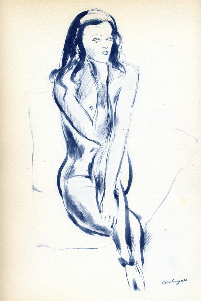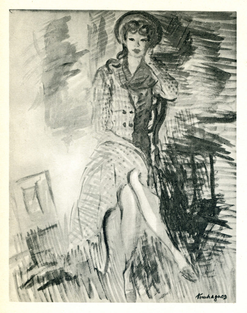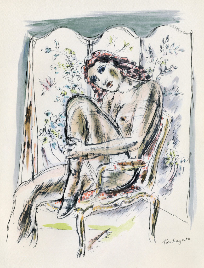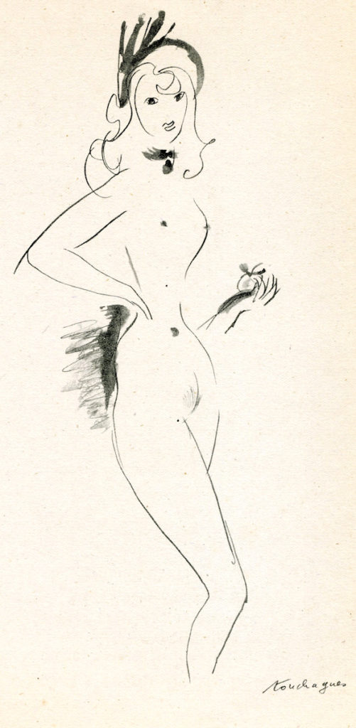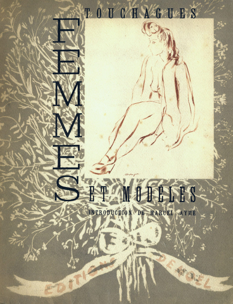 A la Libération, Touchagues publie son premier album de photos de nus, « Femmes et modèles » avec une introduction de Marcel Aymé. Il n’avait jusque là pas publié d’album de dessins sous sa signature. Il avait bien sûr dessiné et peint des nus mais ce n’était qu’un sujet parmi d’autres. Avec cet album, il devient « le peintre de la femme », réputation qui le poursuivra jusqu’à sa disparition. Une petite série d’albums de nus suivra cette publication tandis que les illustrations des autres livres deviendront plus légères. Ci dessous quelques images de cet album « Femmes et modèles ». La technique utilisée est l’eau forte. Encre bleu foncé sur papier épais blanc. Tous les dessins sont signés « Touchagues ». Seul le frontispice est rehaussé de quelques couleurs.