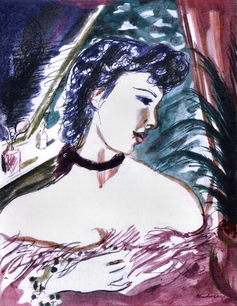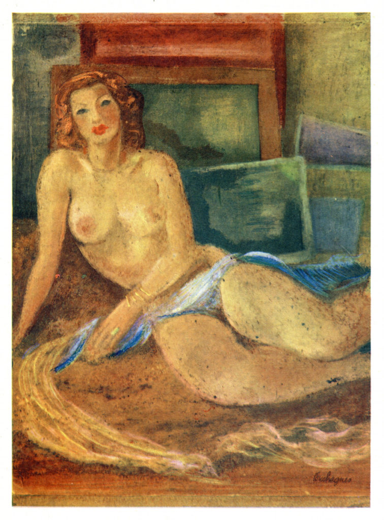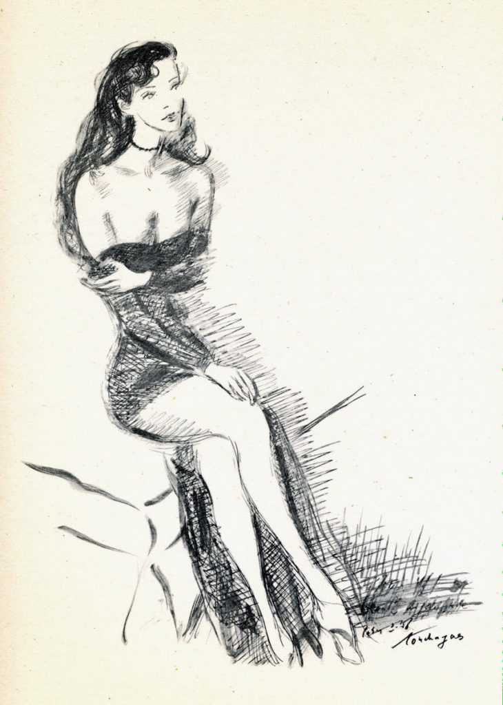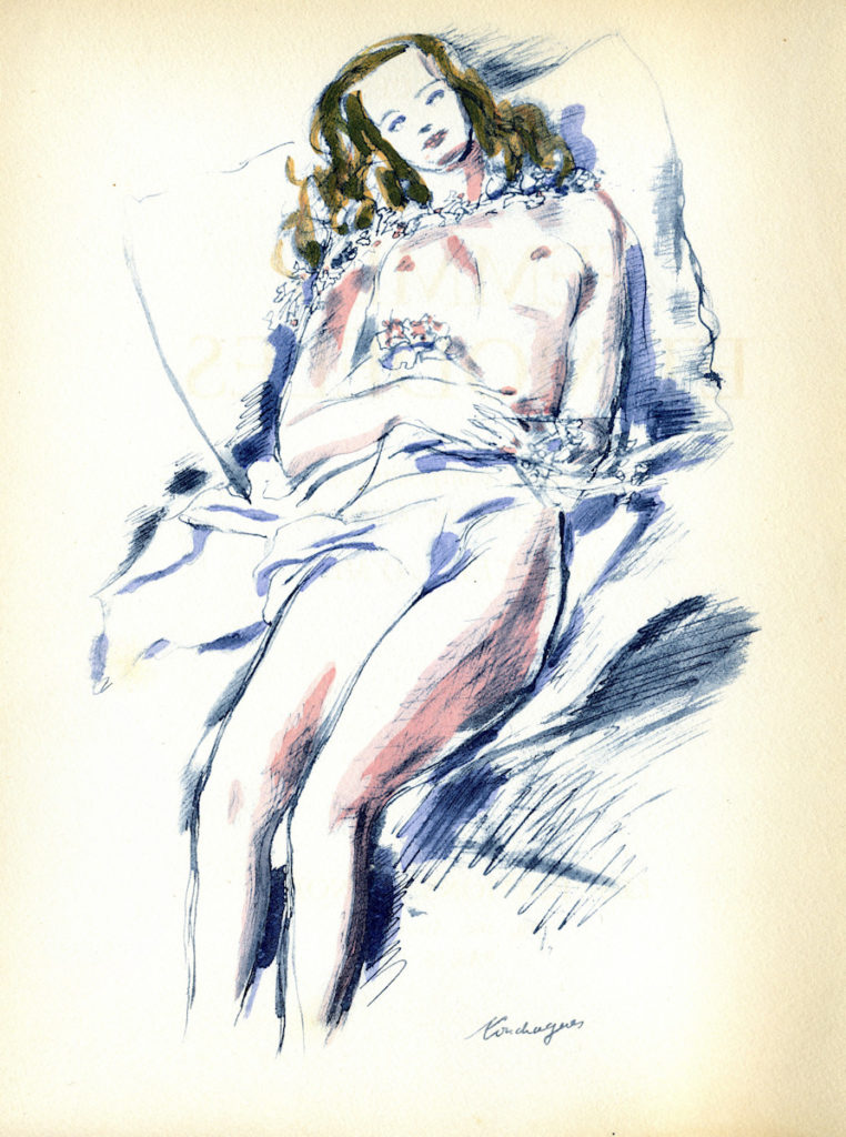 A la Libération, Touchagues publie son premier album de photos de nus, « Femmes et modèles » avec une introduction de Marcel Aymé. Il n’avait jusque là pas publié d’album de dessins sous sa signature. Il avait bien sûr dessiné et peint des nus mais ce n’était qu’un sujet parmi d’autres. Avec cet album, il devient « le peintre de la femme », réputation qui le poursuivra jusqu’à sa disparition. Une petite série d’albums de nus suivra cette publication tandis que les illustrations des autres livres deviendront plus légères. Ci dessous quelques images de cet album « Femmes et modèles ». La technique utilisée est l’eau forte. Encre bleu foncé sur papier épais blanc. Tous les dessins sont signés « Touchagues ». Seul le frontispice est rehaussé de quelques couleurs.