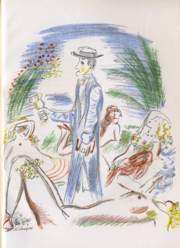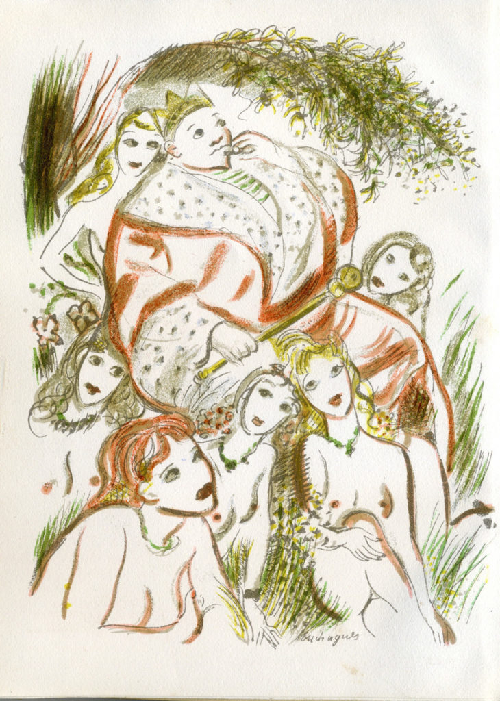Les Aventures du roi Pausole est un roman de Pierre Louÿs édité en feuilleton en 1900. De nombreuses éditions illustrées du roman parurent ensuite. Celle qui nous intéresse a été publiée en novembre 1947 en petit format. Malgré le tirage à 3000 exemplaires, elle comprend quinze lithographies originales de Touchagues tirées sur les presses de l’atelier Mourlot.
