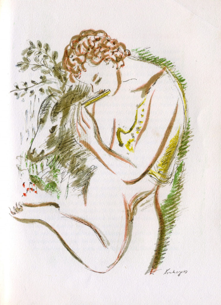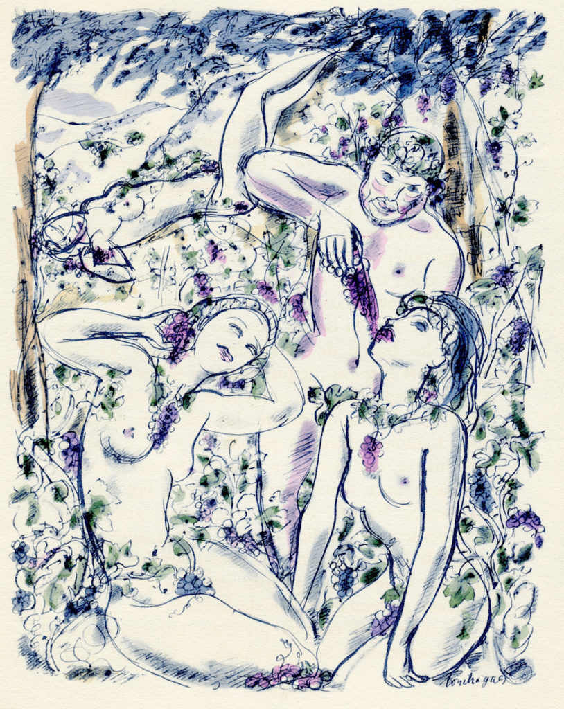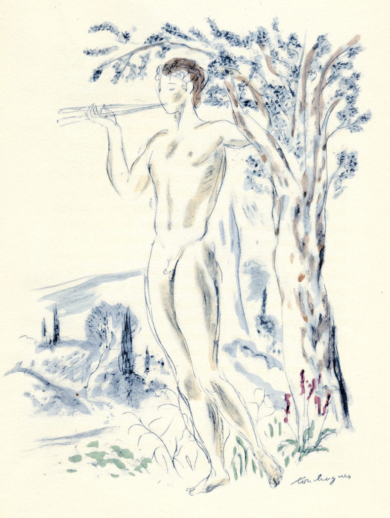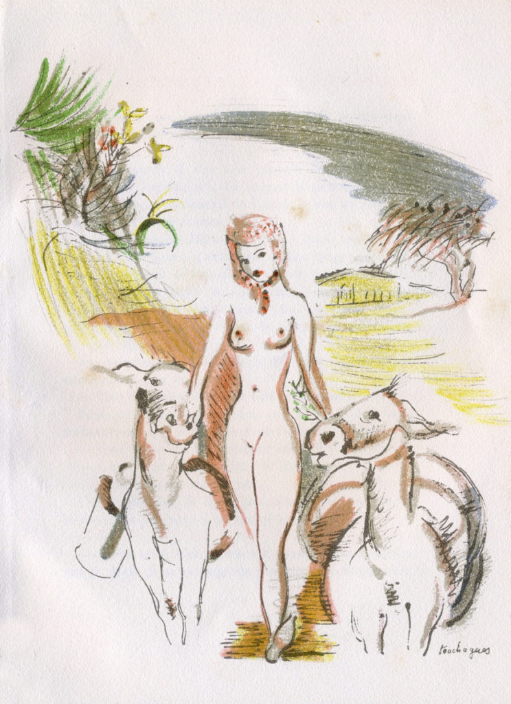 Daphnis et Chloé est une pastorale en prose attribuée à Longus, hypothétique auteur grec du IIe ou IIIe siècle. Le roman fait découvrir la naissance et les progrès de l’amour chez deux bergers adolescents, Daphnis et Chloé. Touchagues se saisit du sujet en posant ses personnages dans une Grèce mythologique idéale, peuplée de bergers nus et de quelques guerriers. D’un trait souple, il esquisse des visages plus grecs que nature. S’il a déjà dessiné beaucoup de jolies jeunes femmes dont il sait tracer d’un trait sûr les seins naissants, on le voit ici un peu moins à l’aise avec les jeunes hommes dont l’expression est plus raide. Certaines des 85 eaux fortes des deux recueils ont été colorées, d’autres sont à peine ébauchées, aériennes. On retrouve l’encre bleu foncé et le papier épais de son album « Femmes et modèles » mais le trait est souvent moins appuyé et les touches de couleur adoucissent les images. En voici un petit échantillon.