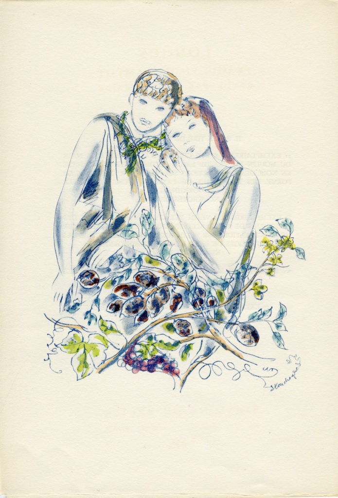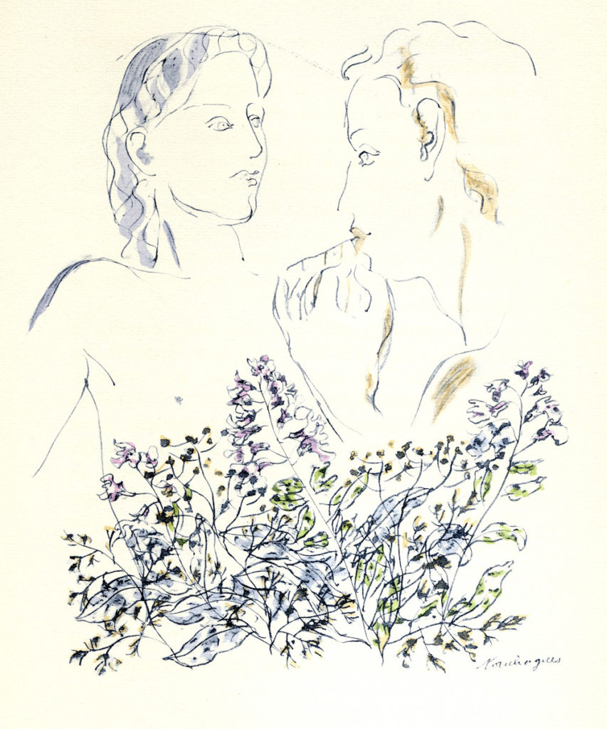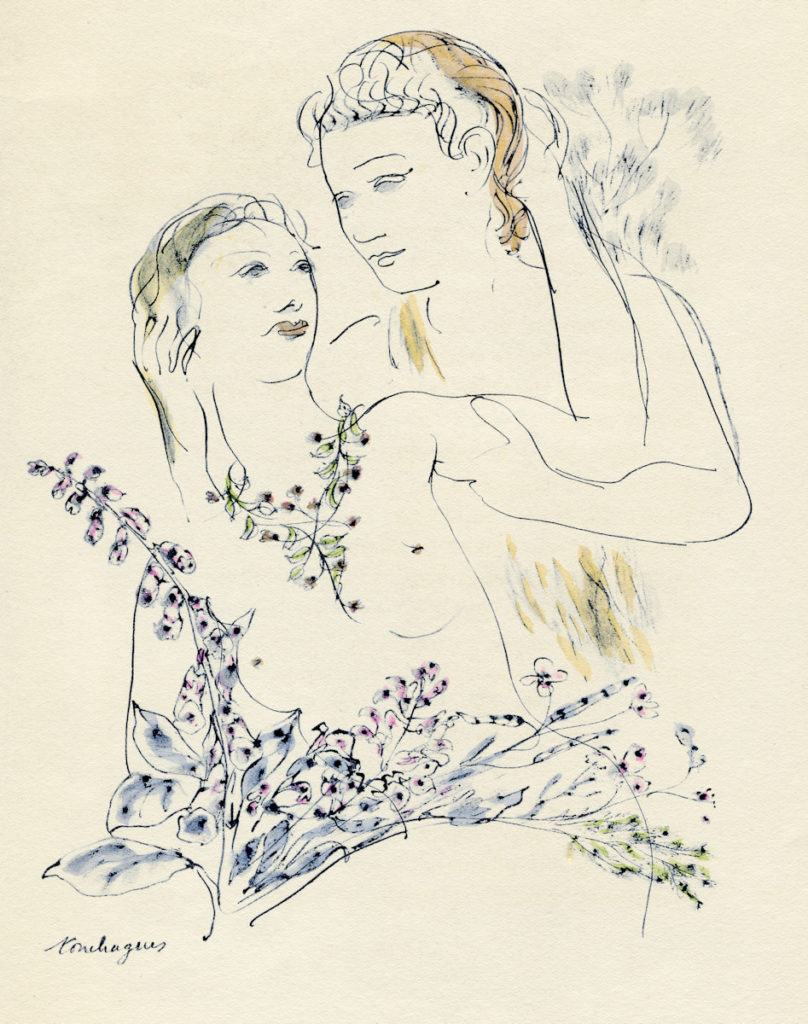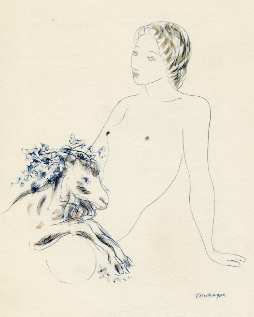 Daphnis et Chloé est une pastorale en prose attribuée à Longus, hypothétique auteur grec du IIe ou IIIe siècle. Le roman fait découvrir la naissance et les progrès de l’amour chez deux bergers adolescents, Daphnis et Chloé. Touchagues se saisit du sujet en posant ses personnages dans une Grèce mythologique idéale, peuplée de bergers nus et de quelques guerriers. D’un trait souple, il esquisse des visages plus grecs que nature. S’il a déjà dessiné beaucoup de jolies jeunes femmes dont il sait tracer d’un trait sûr les seins naissants, on le voit ici un peu moins à l’aise avec les jeunes hommes dont l’expression est plus raide. Certaines des 85 eaux fortes des deux recueils ont été colorées, d’autres sont à peine ébauchées, aériennes. On retrouve l’encre bleu foncé et le papier épais de son album « Femmes et modèles » mais le trait est souvent moins appuyé et les touches de couleur adoucissent les images. En voici un petit échantillon.