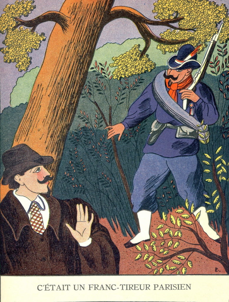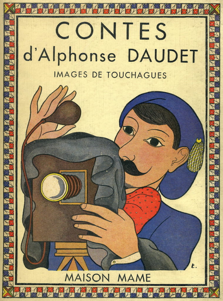 Ce livre est un recueil posthume de contes et nouvelles publiés par Daudet dans la presse française entre 1871 et 1887. En 1936, la maison Mame, éditeur spécialisé dans la littérature religieuse et enfantine, demande à Touchagues d’illustrer six contes et nouvelles rassemblés dans une belle édition comprenant 16 lithographies couleur pleine page et de nombreux dessins en noir et blanc dans le texte. Il ne s’agit pas de contes pour enfants ; beaucoup baignent dans l’ambiance nationaliste revancharde qui suit la défaite contre l’empire prussien. Touchagues se met au travail et produit 16 lithographies très soignées aux à-plats de couleurs vives dans un style proche de celui des images d’Epinal et de certaines bandes dessinées actuelles. Toutes sont signées d’un « t. ». Il ne semble pas que Touchagues ait livré d’autres travaux de ce style plus tard. Quelques images ci dessous :