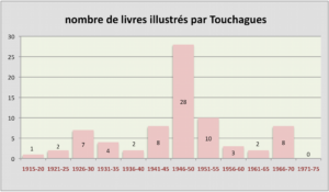 A partir de cet inventaire, on peut estimer que Touchagues a produit environ 1200 dessins pour l’illustration de ces 75 livres édités en France entre 1918 et 1970. Comme il était hors de question de les décrire tous, nous avons choisi de découper son œuvre en deux grandes périodes : l’entre deux guerres et l’après deuxième guerre mondiale où Touchagues a travaillé avec des styles assez différents. Sur chaque période nous présentons une poignée de livres avec quelques illustrations représentatives, faisant ainsi prendre conscience de la variété de l’œuvre et de son évolution. La présentation est faite par ordre chronologique.