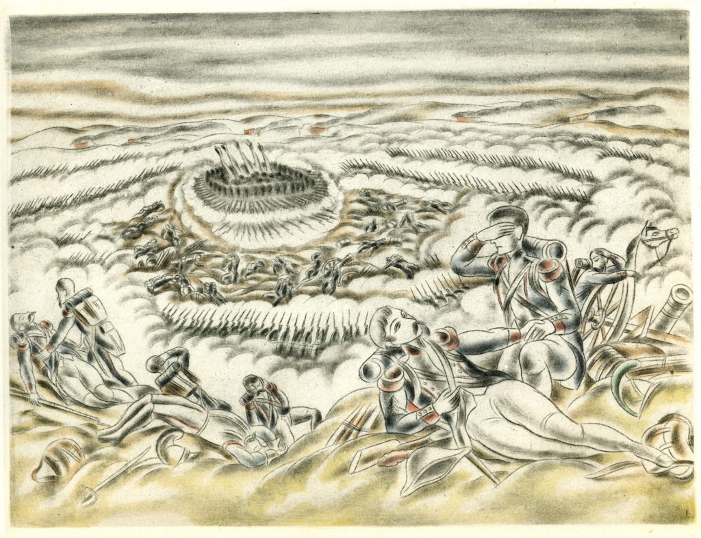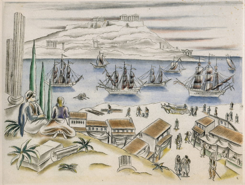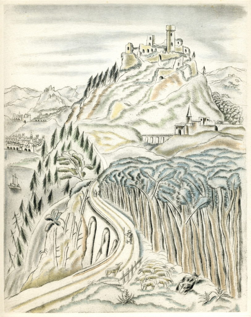 Le Pèlerinage de Childe Harold est un long poème narratif en quatre chants écrit par Lord Byron et publié entre 1812 et 1818. Le poème décrit les voyages et les réflexions d’un jeune homme fatigué du monde qui, désillusionné par une vie de plaisirs et de débauches, cherche la distraction en voyageant. Il passe en particulier par la Grèce sous occupation ottomane et se retrouve au cœur de la bataille de Waterloo. En 1930, Trémois en republie une traduction française dans une belle édition d’art non reliée accompagnée d’eaux fortes de Touchagues coloriées à la main. Ce sont des dessins délicats, presque oniriques qui traduisent bien l’état d’esprit de Byron, spectateur désabusé du monde. Elles ont été très remarquées à leur parution en 1930 : la presse littéraire (L’Art Vivant et Le Crapouillot) en a publié des reproductions assez sommaires, qui donnaient envie de voir les originaux. Leur style, trait mince et estompage en couleurs éteintes, préfigure celui que Touchagues utilisera pour ses illustrations publiées dans la presse périodique des années 30. Quelques images ci après :
