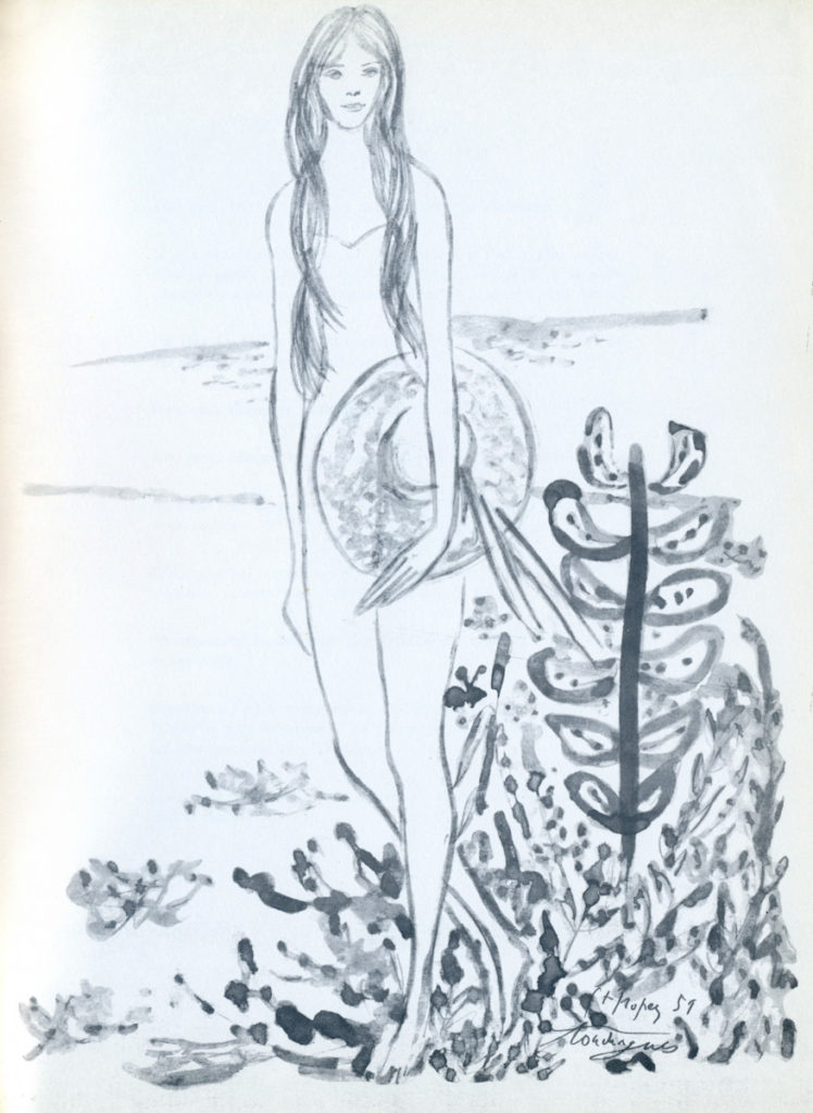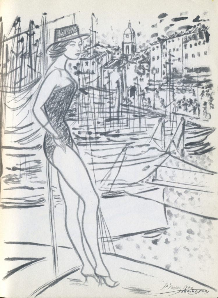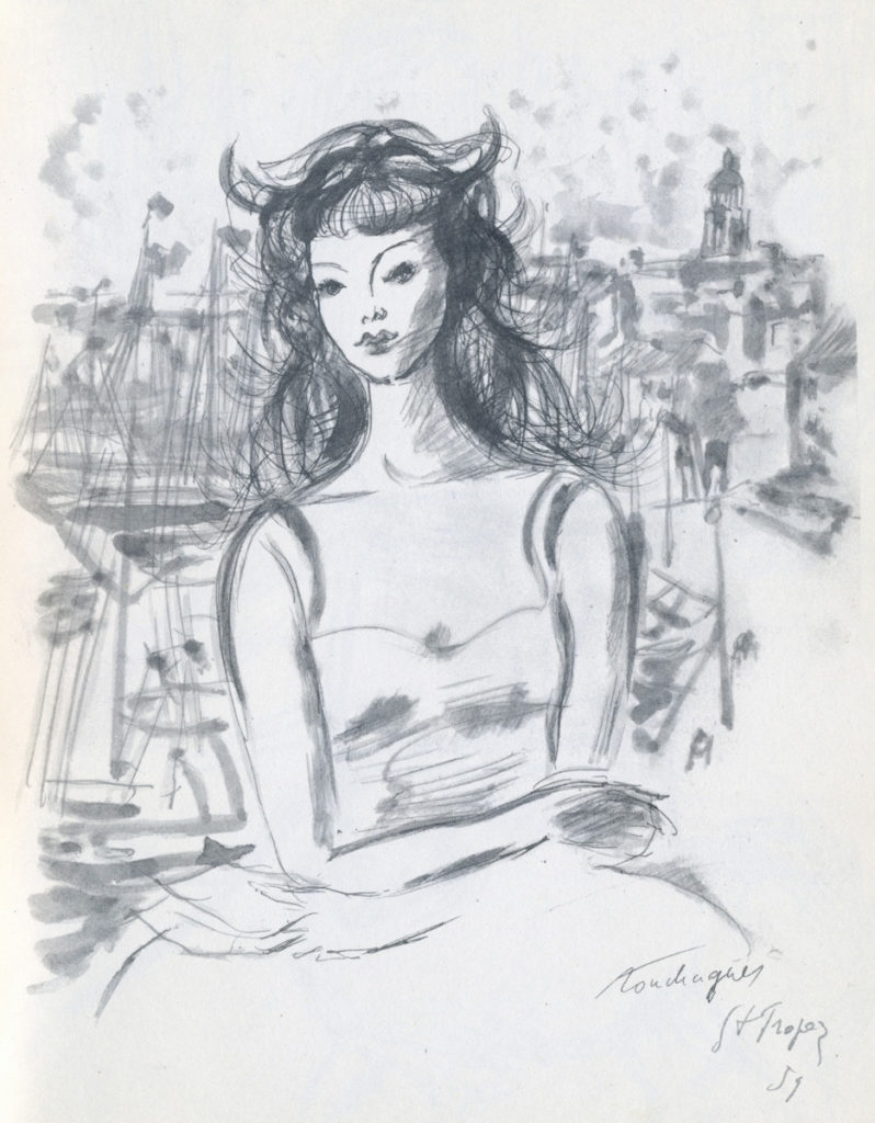 Troisième et dernier album de dessins de Touchagues publié en 1962. Il est composé d’une soixantaine de dessins de jeunes femmes mises en scène sur la Côte d’Azur : Saint Tropez, Grimaud, la plage de Pampelone, … La plupart des dessins ont été exécutés à l’aquarelle puis imprimés en photogravure : quelques images sont imprimées en couleurs mais la plupart sont en gris. Si on en croit les signatures, ces scènes ont été captées dans un intervalle de temps assez court entre 1959 et 1961. L’album a été tiré à 1150 exemplaires : ce n’est pas une édition d’art pour bibliophiles avec des nus provocants. Touchagues s’est le plus souvent attaché à mieux détailler les visages, assez réussis, que les corps nus, quelquefois à peine ébauchés. Quelques pages de commentaires de Touchagues sont intercalées entre les dessins. Par exemple : « Saint-Tropez, c’est les cinq parties du Monde dans quelques kilomètres carrés » ou « On voit de fins visages, avec de belles petites bouches engloutir des tonnes de crêpes aromatisées« .